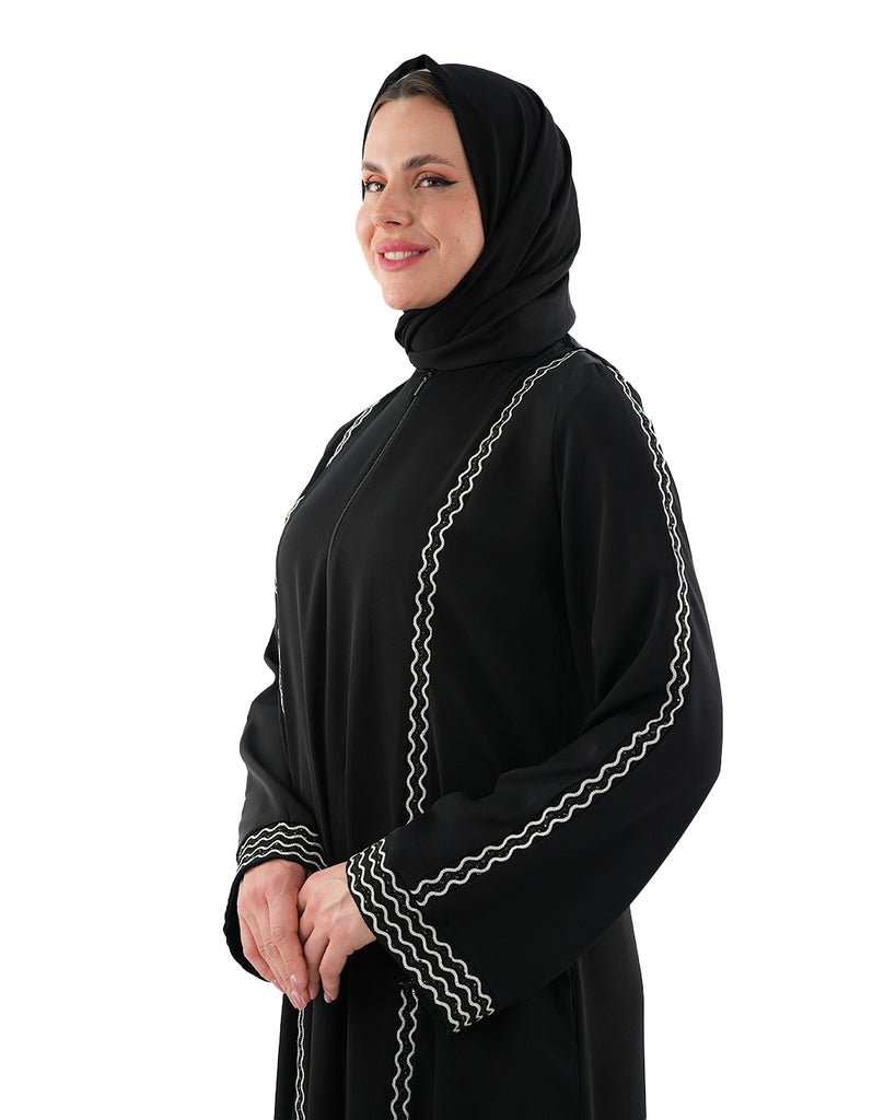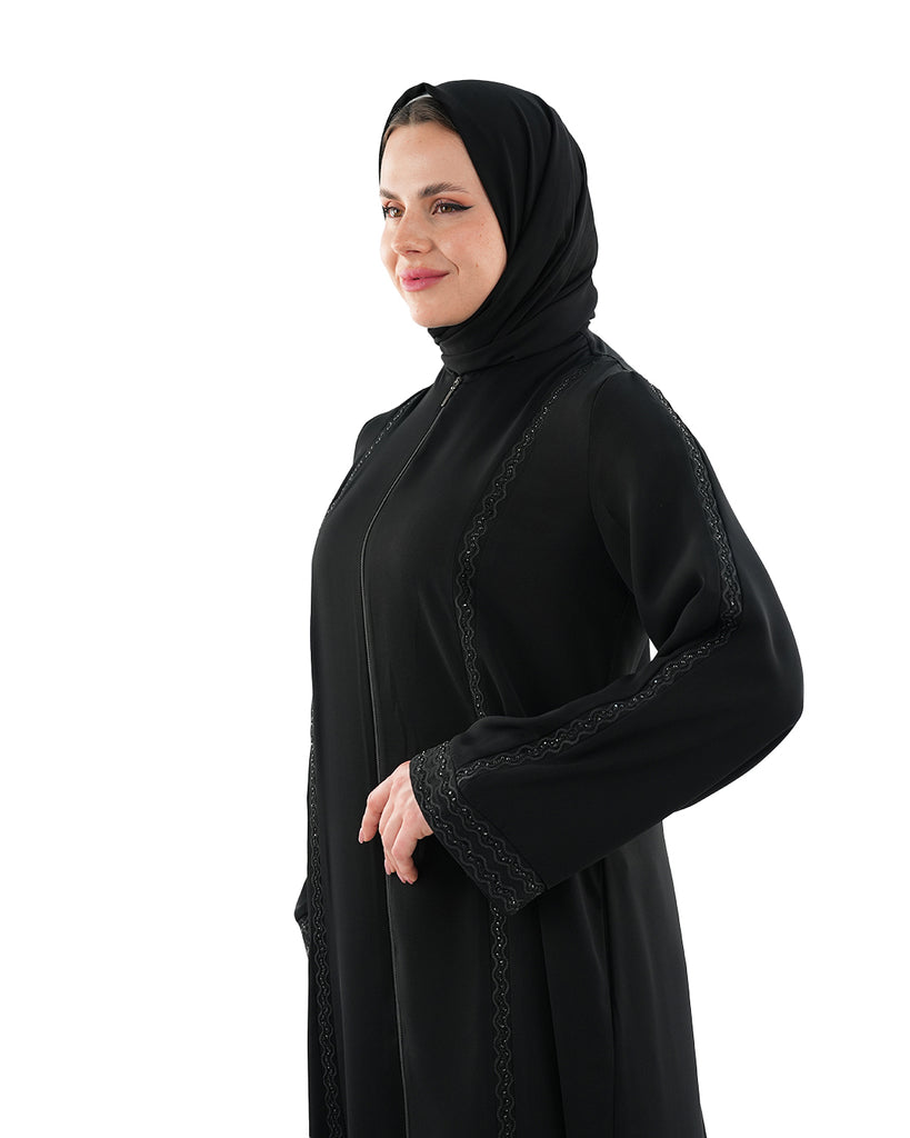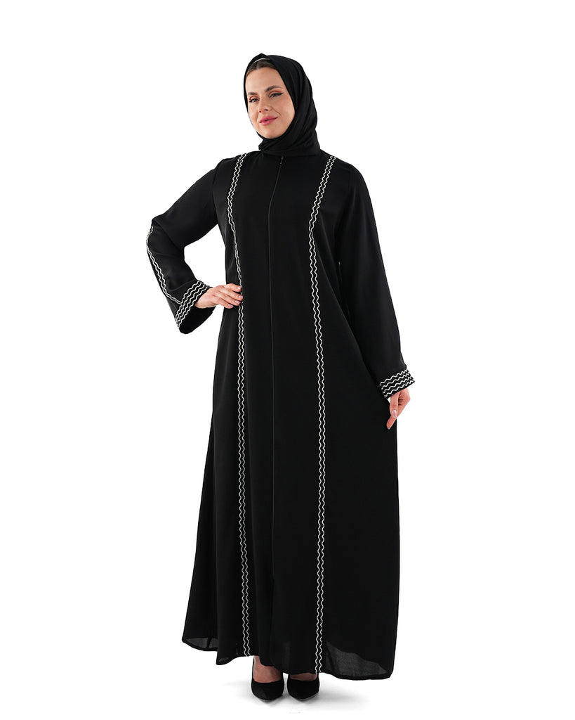 An elegant abaya featuring exquisite embroidery that adorns the front and sleeves, adding a refined feminine touch. A perfect blend of simplicity and luxury, making it a standout piece suitable for chic everyday looks.