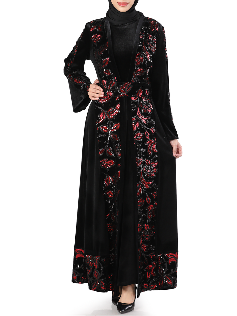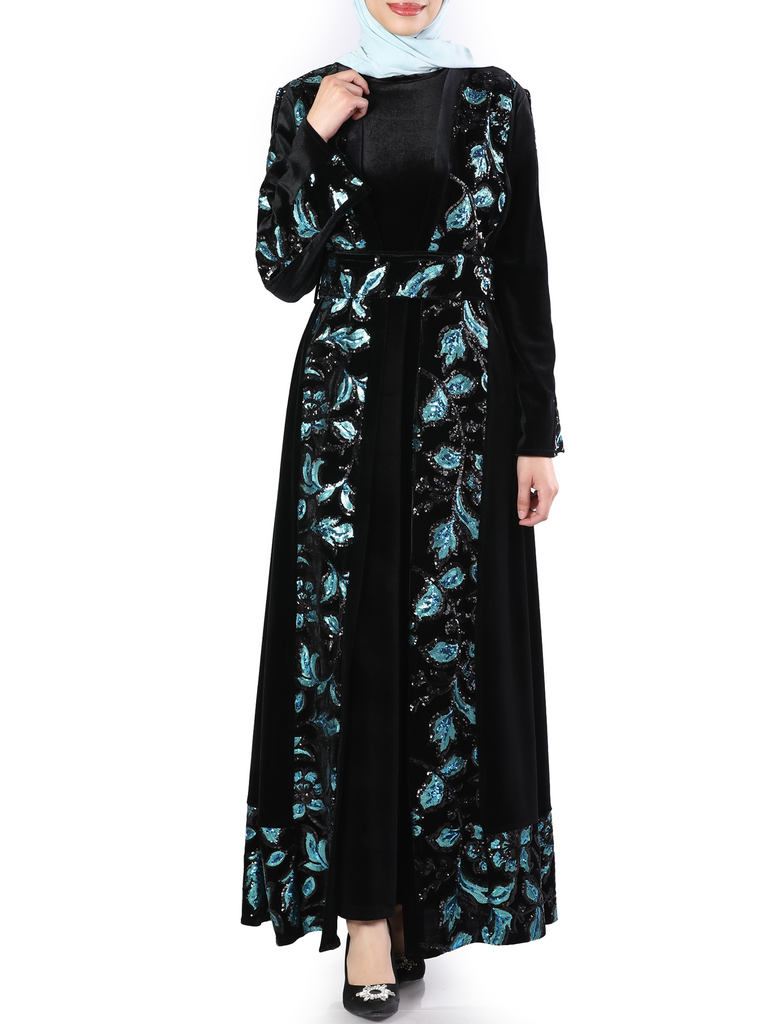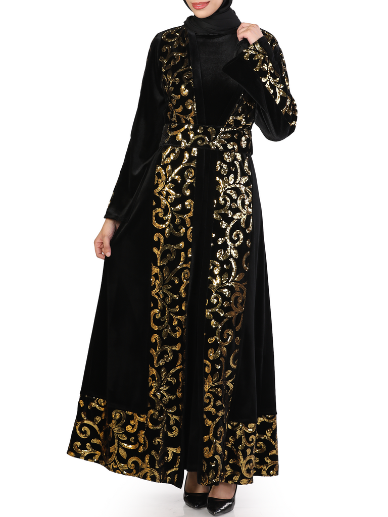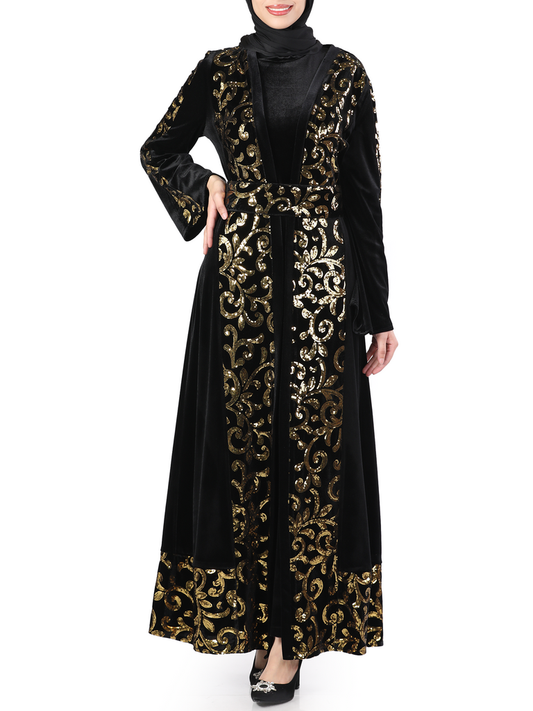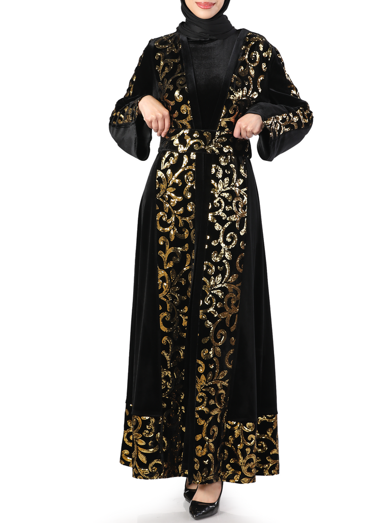 This besht is a wonderful piece of art that displays intricate designs and inscriptions. Besht is available in several colors, including black and sky blue, black and red, black and gold, and plain black. The besht consists of two pieces: the upper one and the lower one. The top piece is made of luxurious velvet, decorated with bright and shiny embroidery. The bottom piece is made of soft and comfortable fabric, matching the color of the embroidery. The Bisht is full-length, and gives the wearer an elegant and sparkling look.