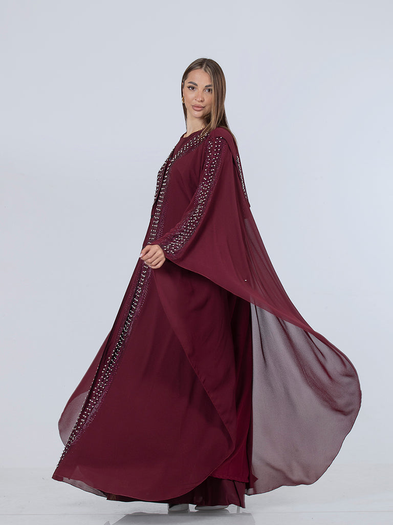 Beautifully embellished with golden beads and rhinestones along the edges and sleeves, adding a radiant sparkle with every move.