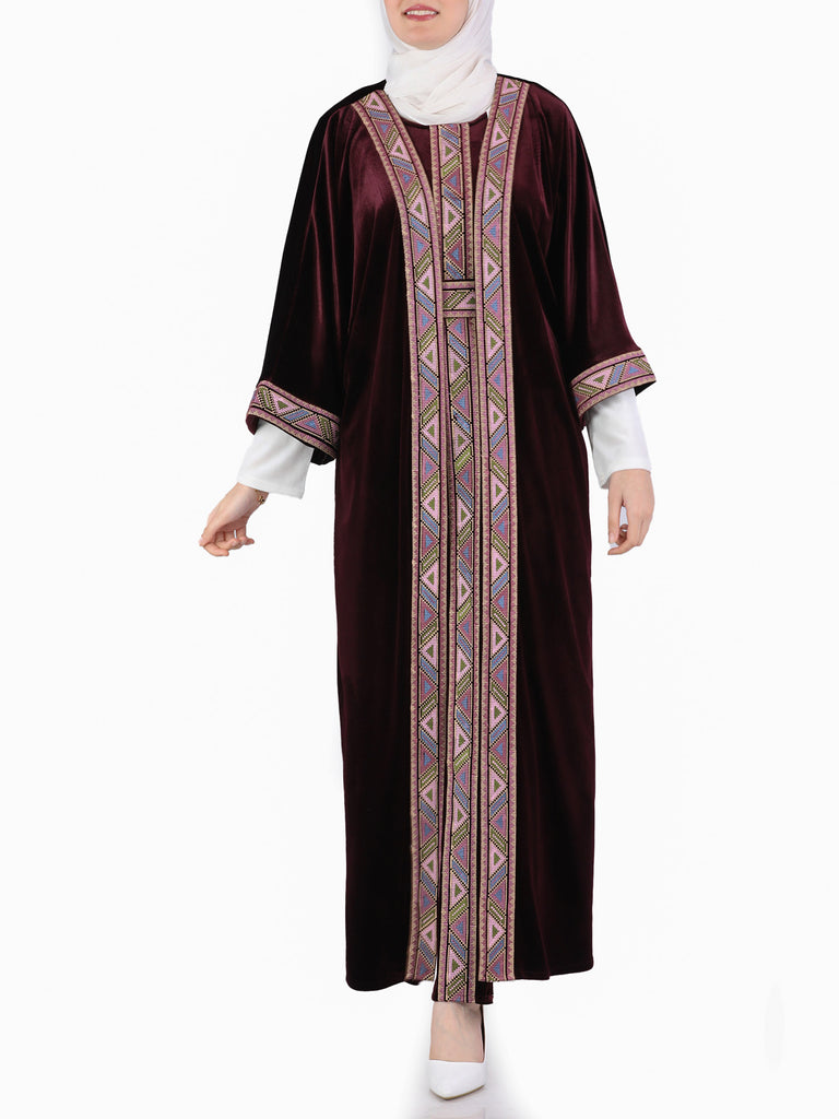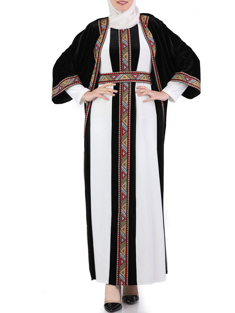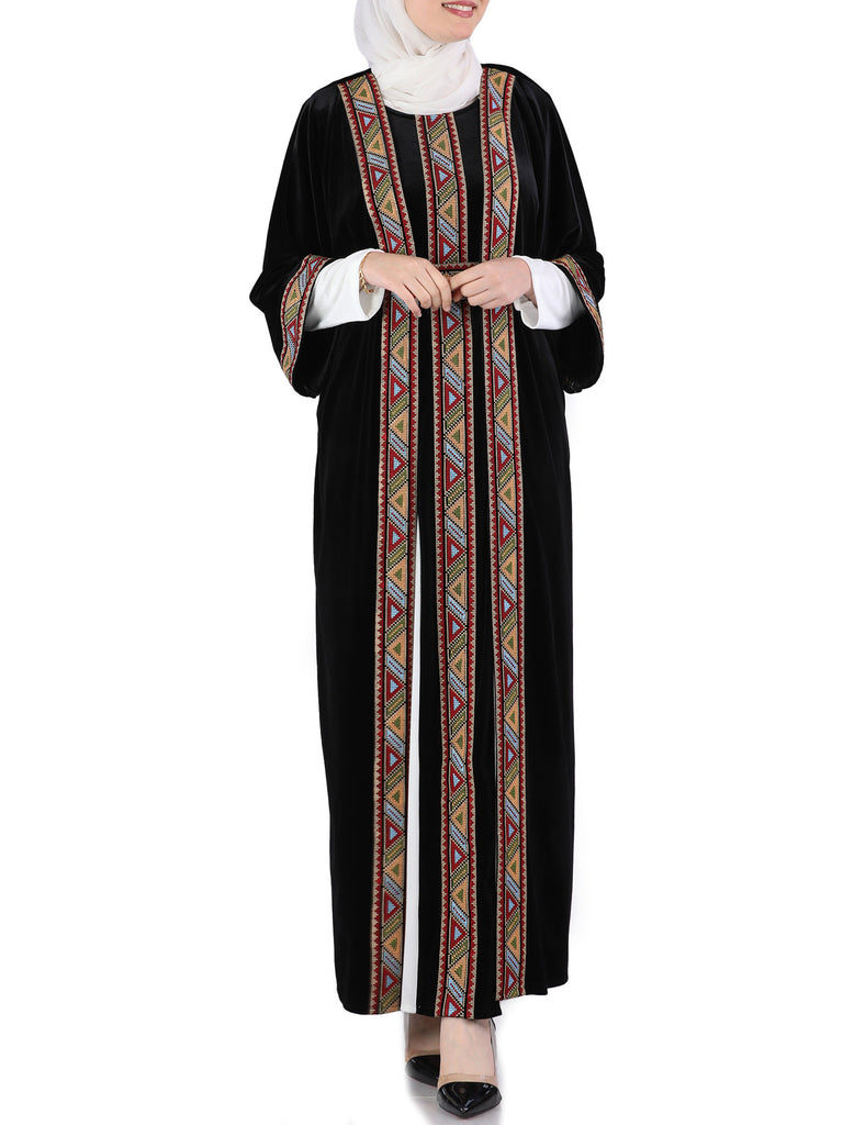 The sleeves of the bisht are also dark-colored but have thin stripes of colorful embroidery at their ends.