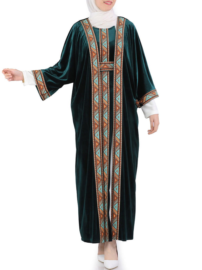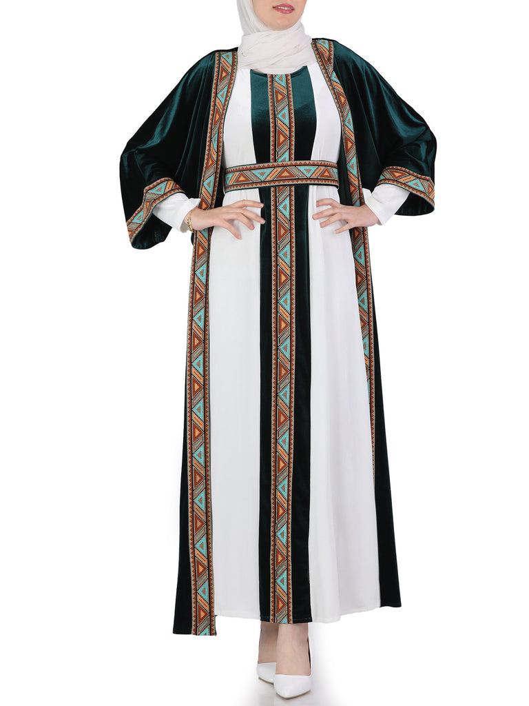 The front panel and belt of the bisht is embellished with intricate geometric patterns.
