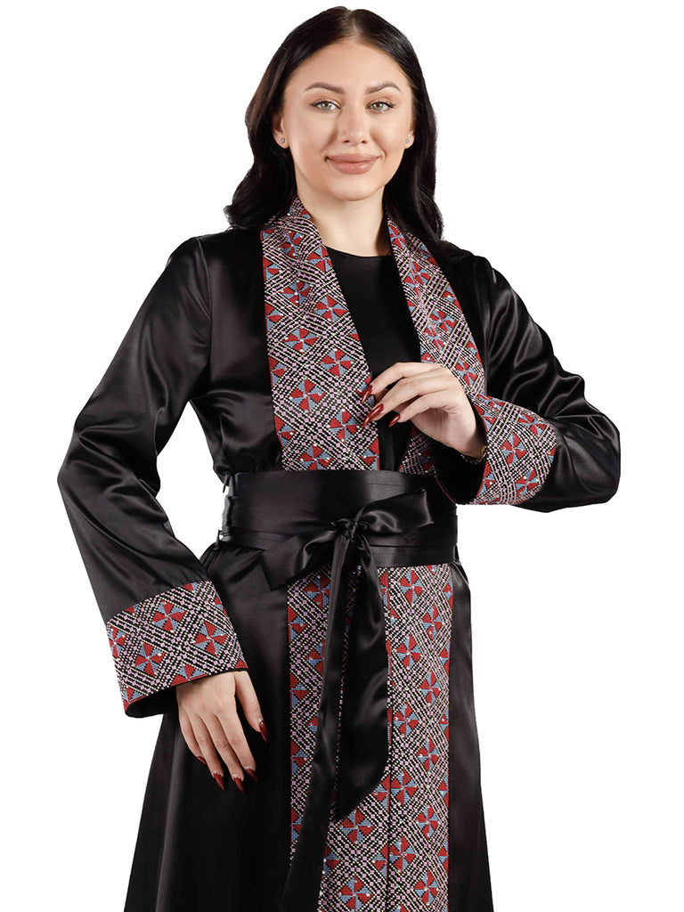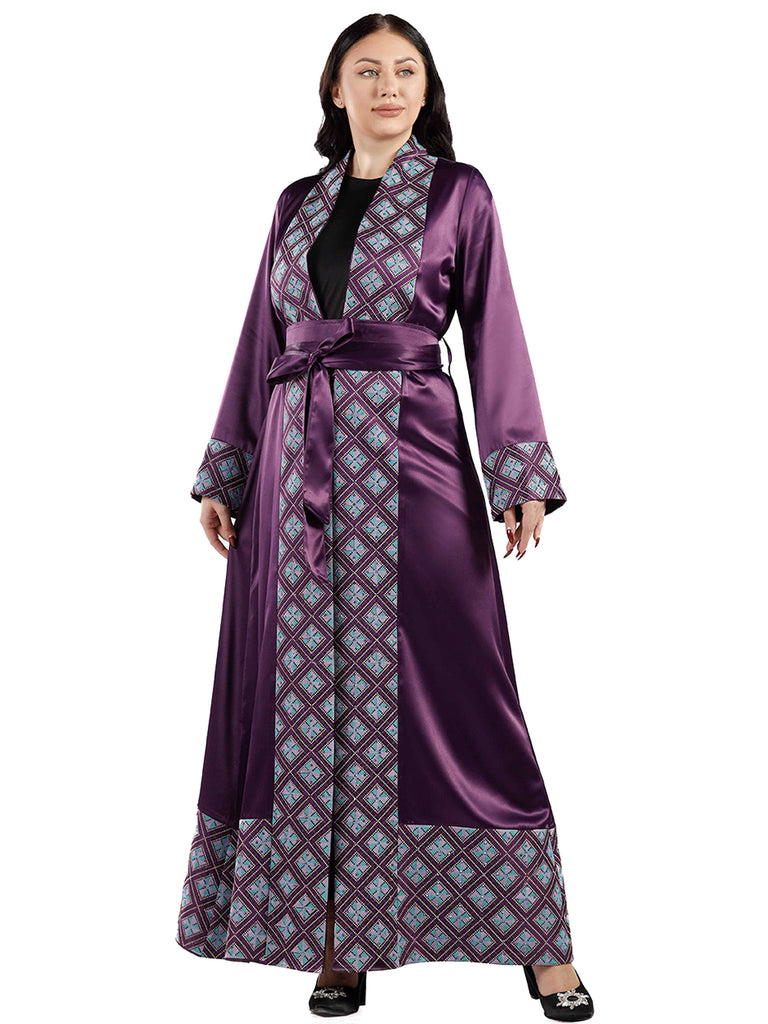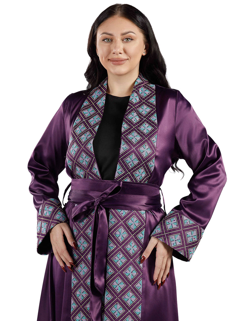 - Sleeves: long and wide, decorated with gold embroidery on the bracelets. The patterns used in embroidery are symmetrical geometric shapes and simple flowers. - Front part: it has golden embroidery on the front edge of the Bisht. The patterns used for embroidery are the same as for the sleeves. - Back part: it does not have any details or inscriptions, to match the decorative front part. - Color: the pastel color matches the color of the golden embroidery. This Color gives the Bisht a calm and refined look.