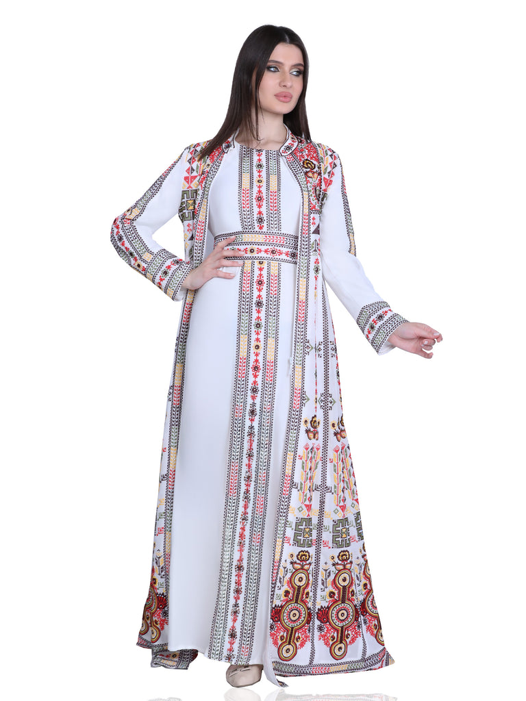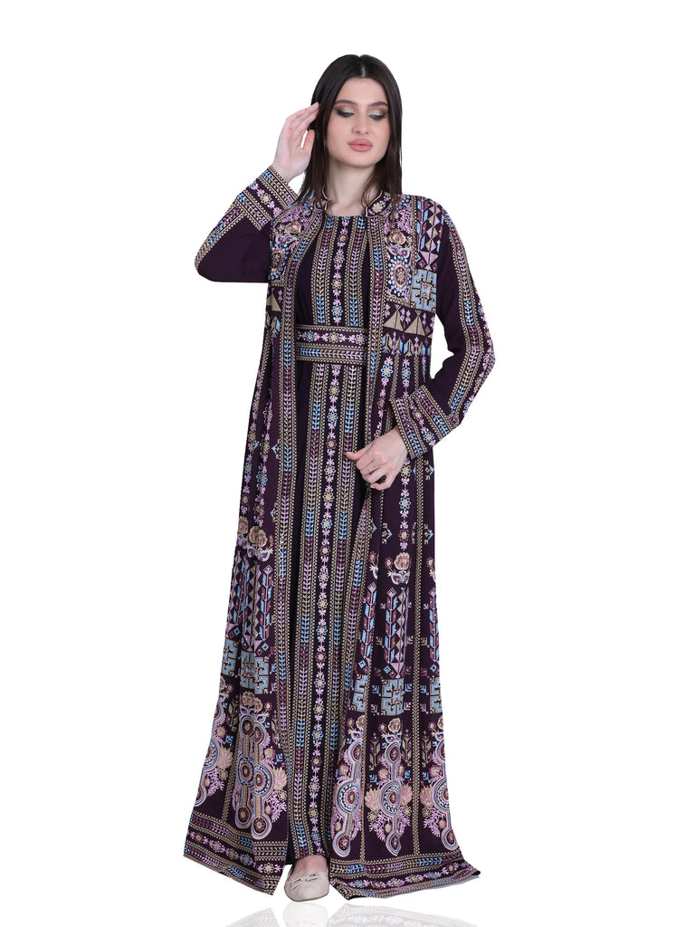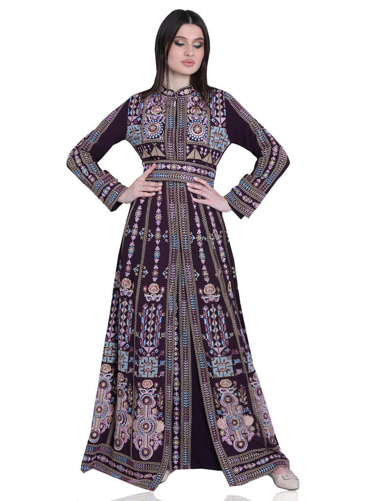 A luxurious kaftan featuring an elegant harmony of three colors: a base of pure white, shimmering embellishments and embroidery, and royal mauve accents on the edges and sleeves — giving it a regal and refined appearance.