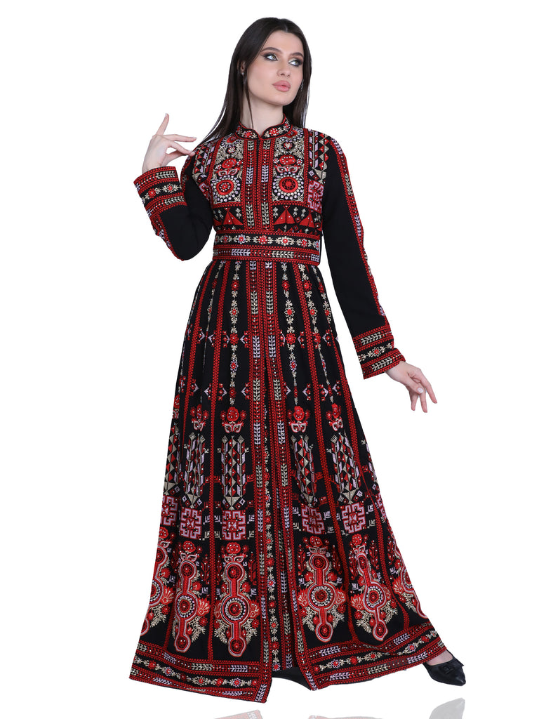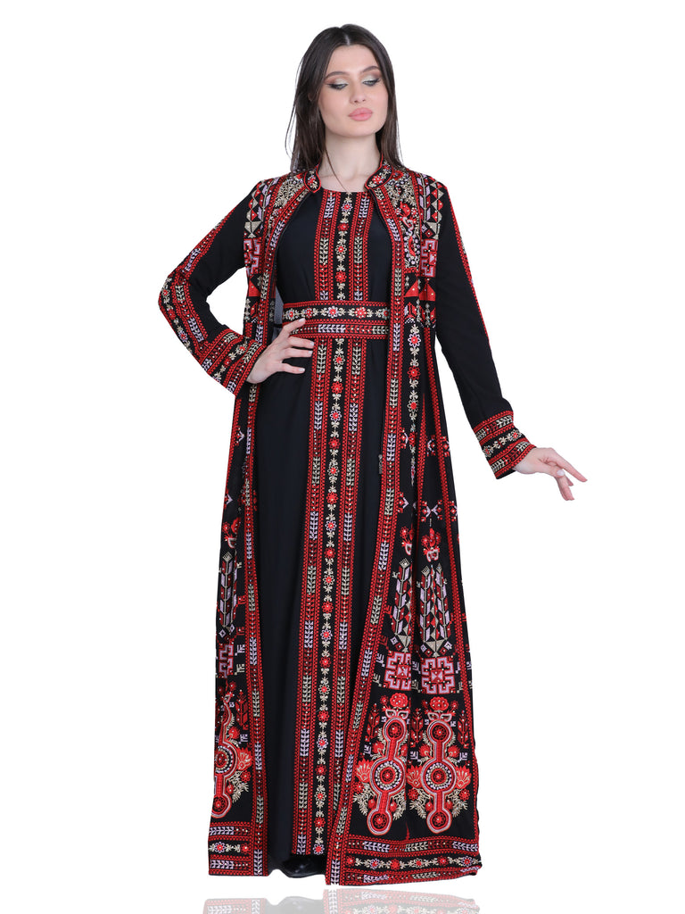 The design is inspired by rich traditional heritage, yet infused with a modern touch that adds extra elegance. The fabric is made of finely embroidered silk, paired with a belt that accentuates the waist and gives the kaftan a beautifully feminine silhouette.