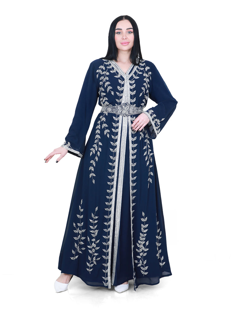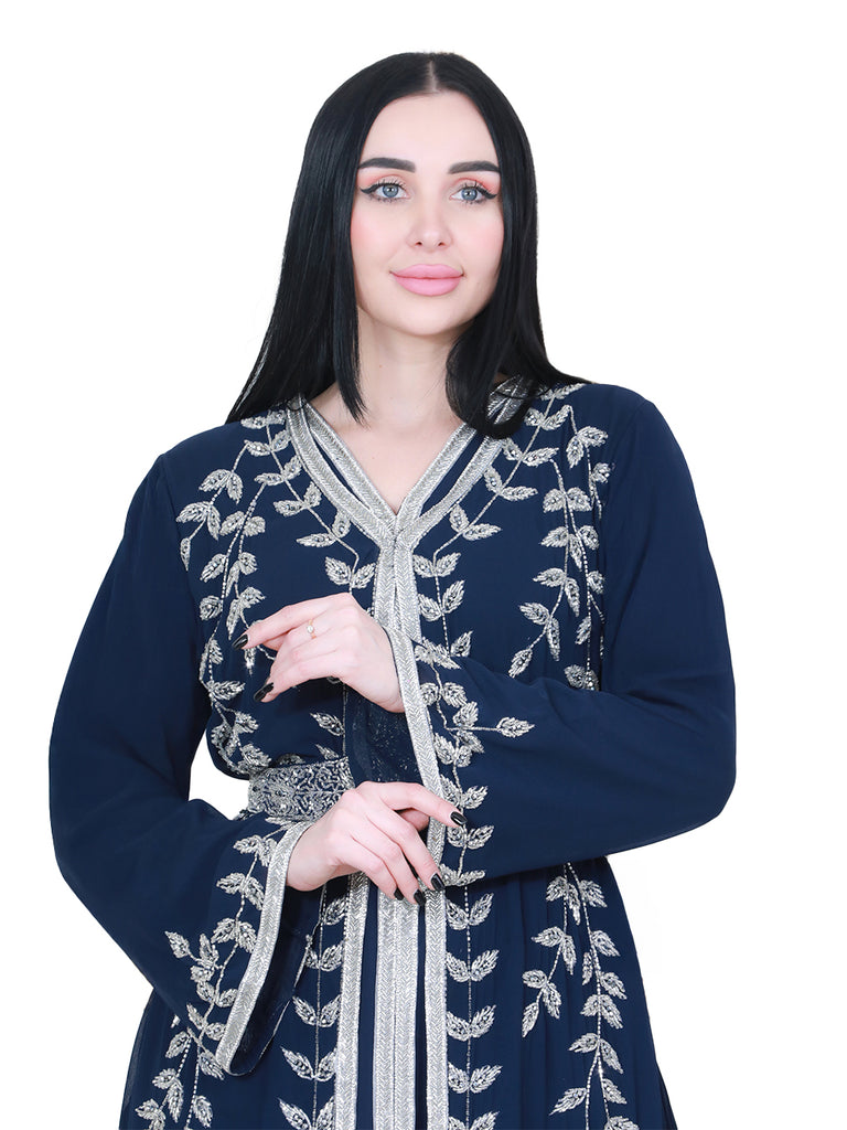 This kaftan features a rich deep navy color, adorned with graceful vine-like patterns that flow from the bodice down to the hem and sleeves. A fully hand-beaded belt cinches the waist, adding a soft, feminine charm and enhancing the silhouette with elegance.