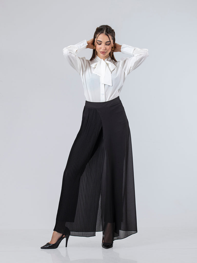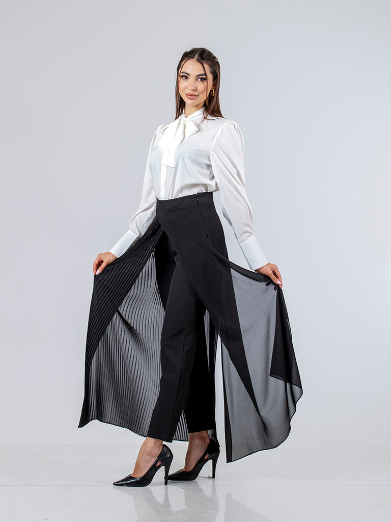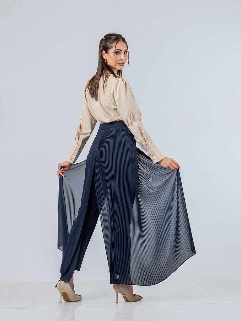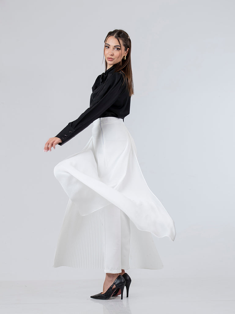 Features an asymmetrical design — one side has a sleek, classic straight cut, while the other showcases pleated detailing that flows like a skirt, adding a bold and stylish contrast.