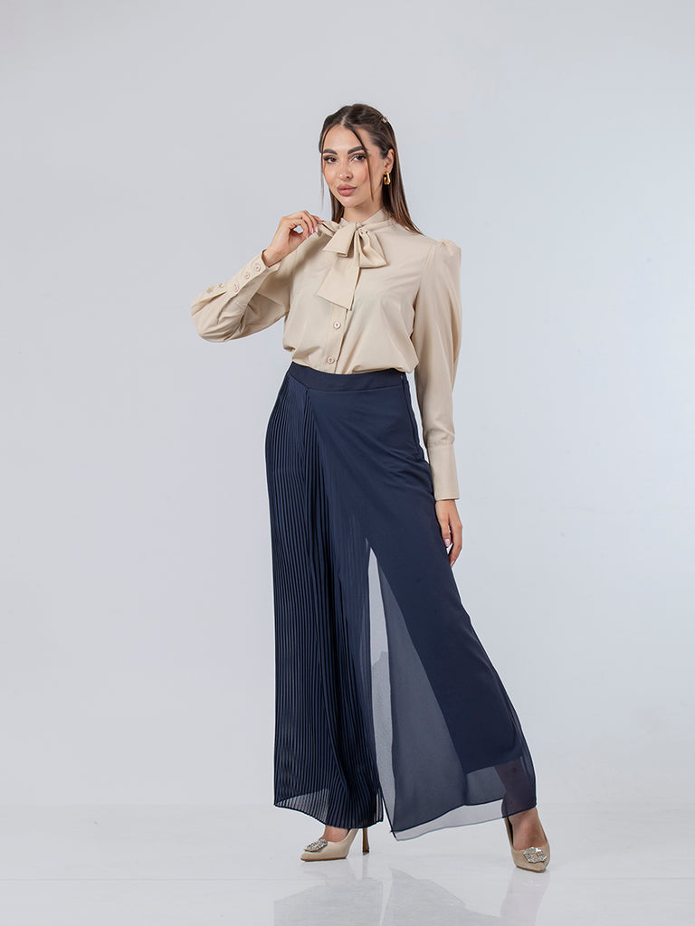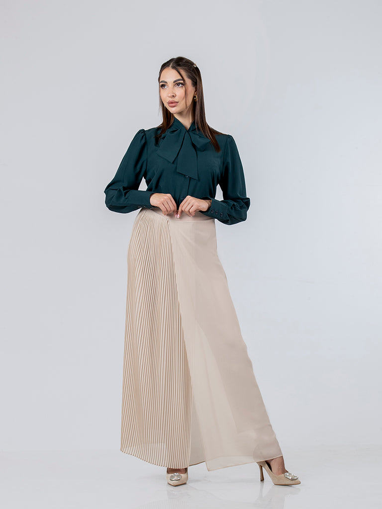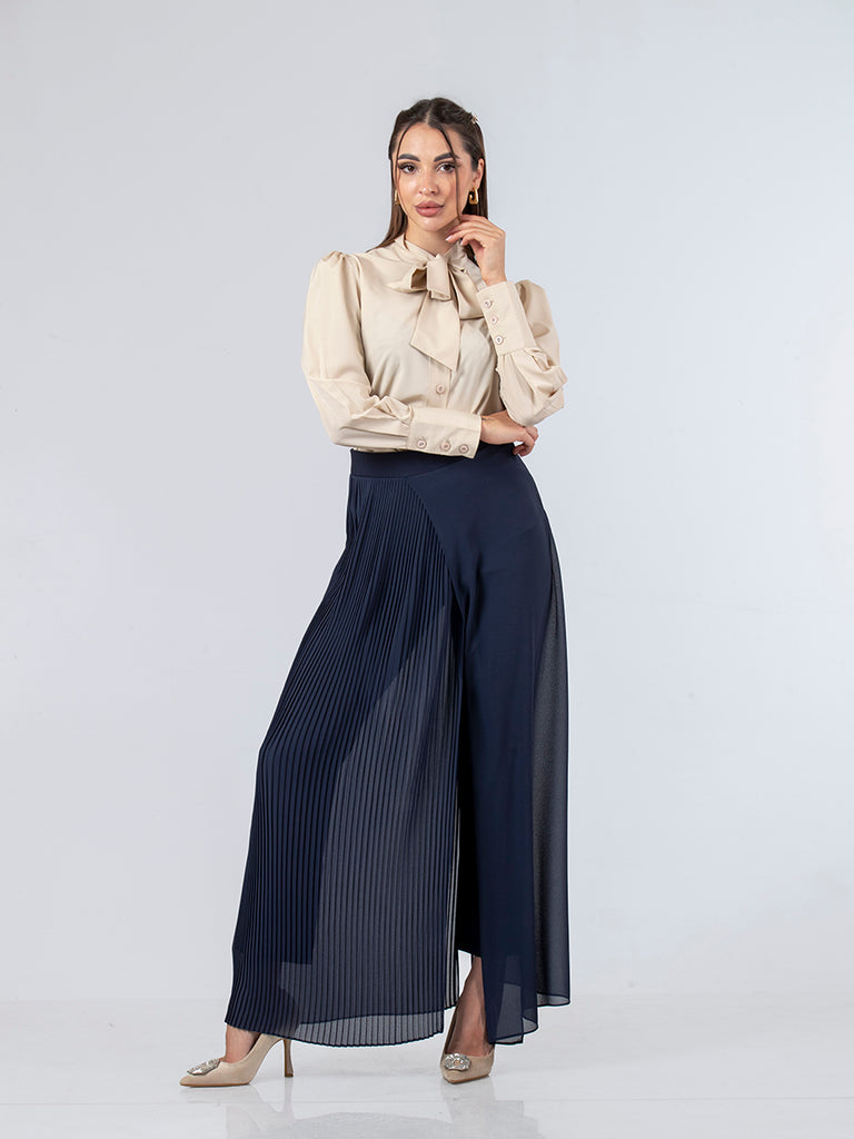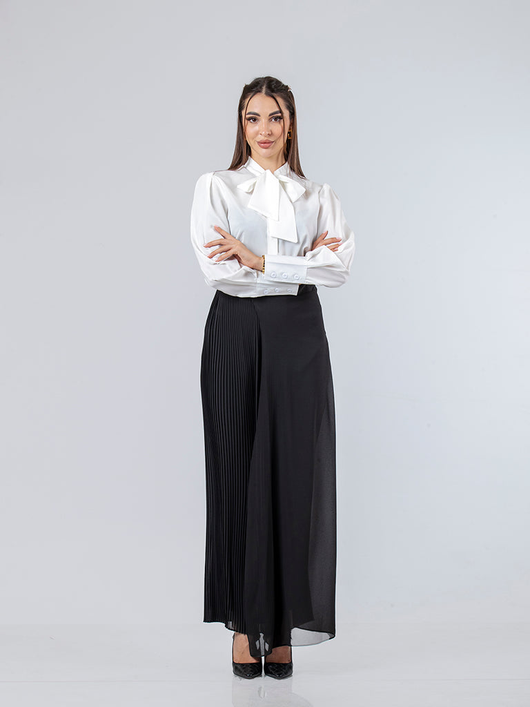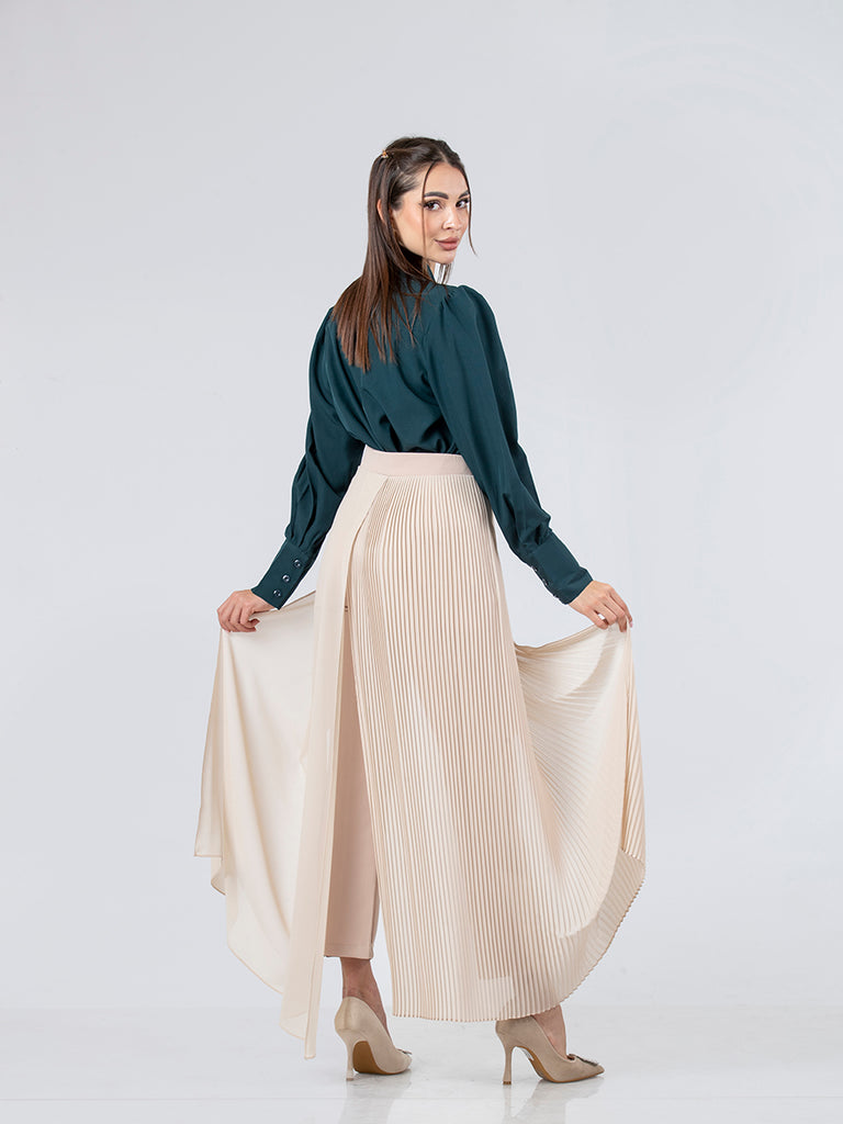 Features an asymmetrical design — one side has a sleek, classic straight cut, while the other showcases pleated detailing that flows like a skirt, adding a bold and stylish contrast.