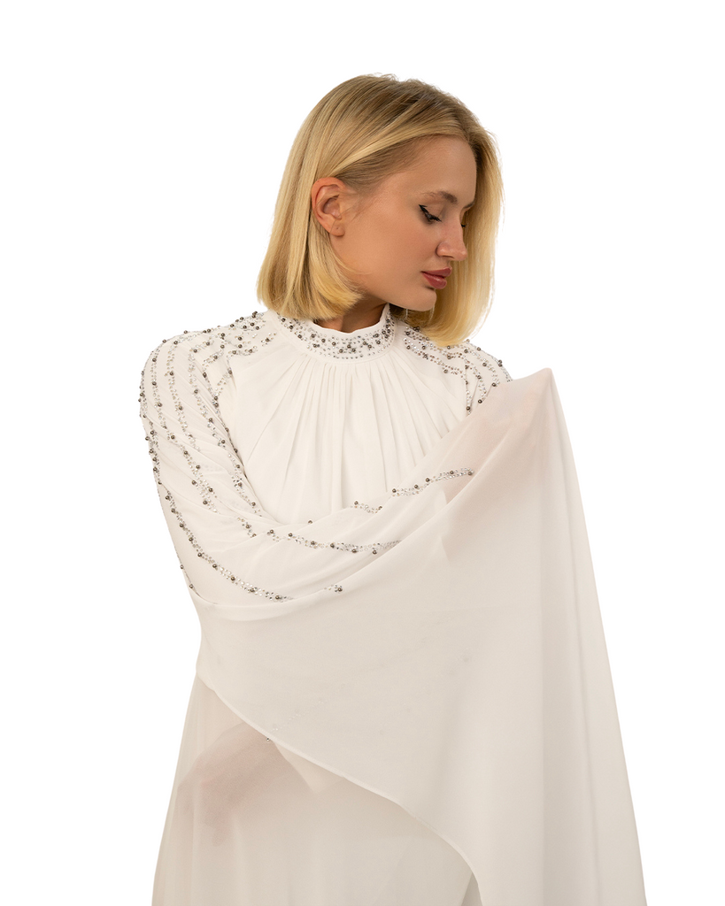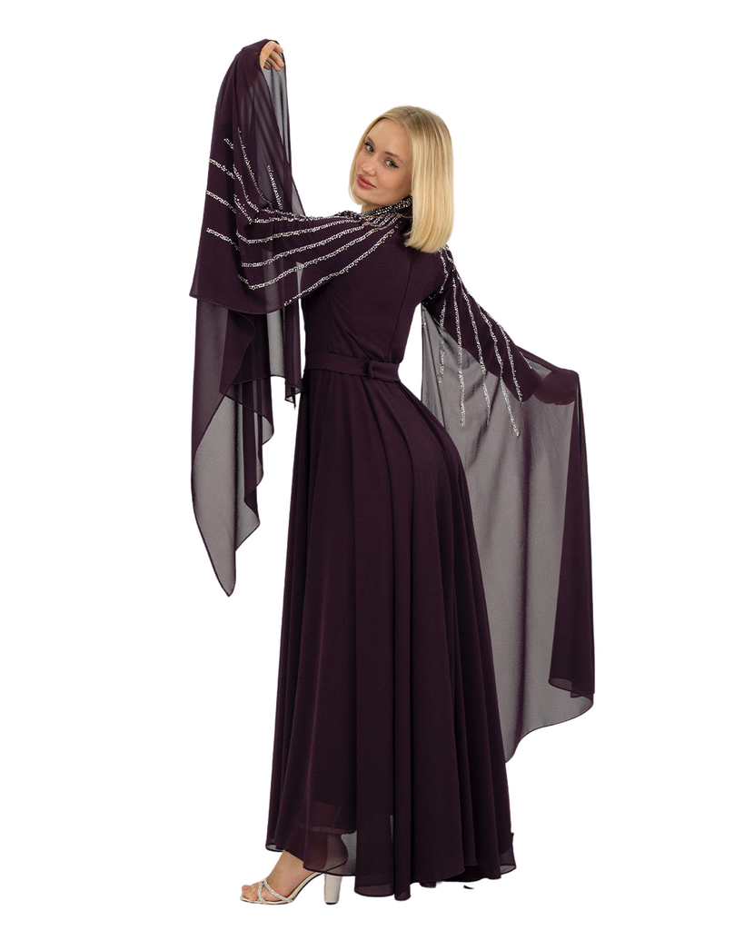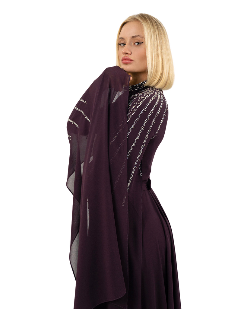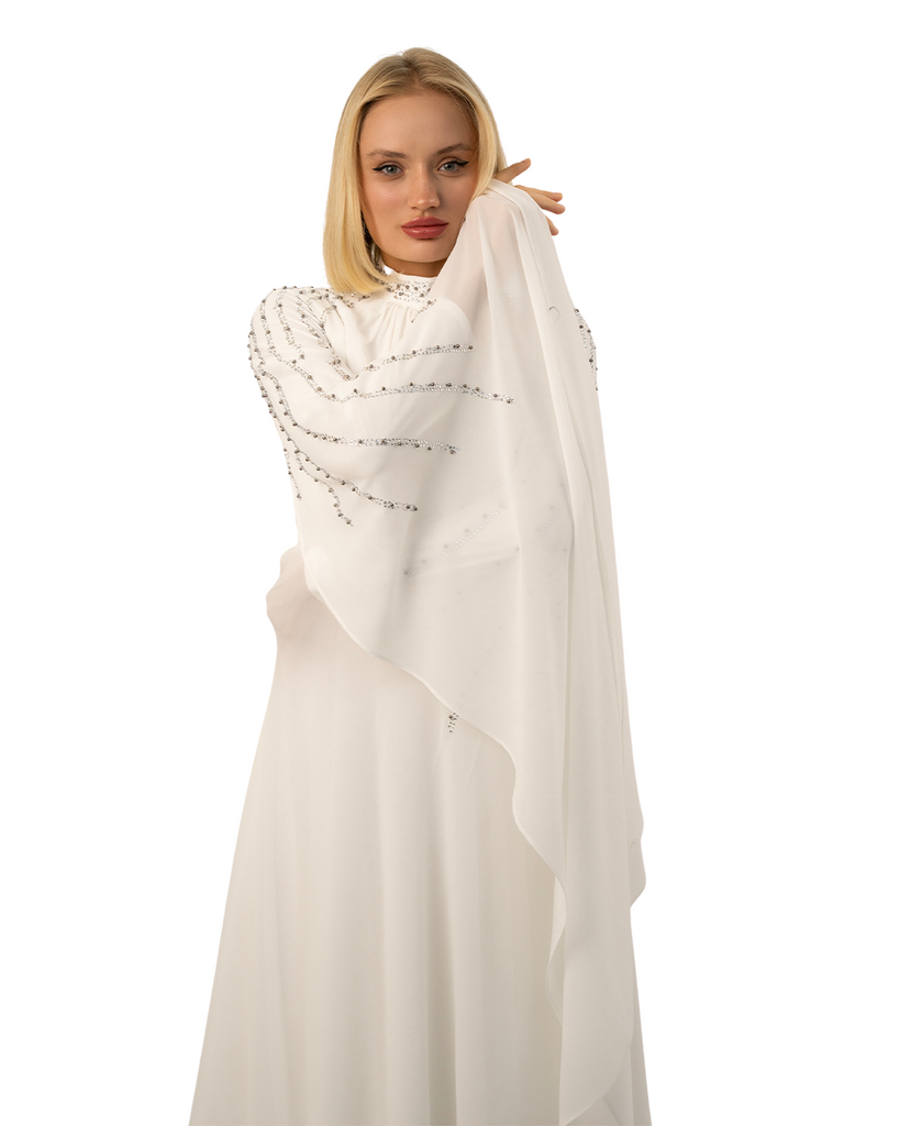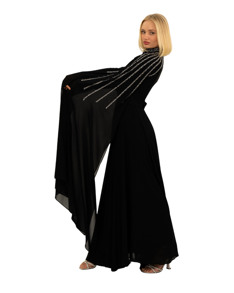 A feminine gown with luxurious details, made from soft chiffon that flows gracefully, and delicately embellished with shimmering rhinestones that add a magical touch to every move