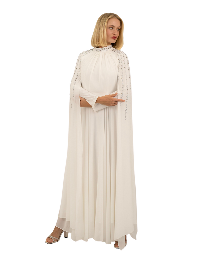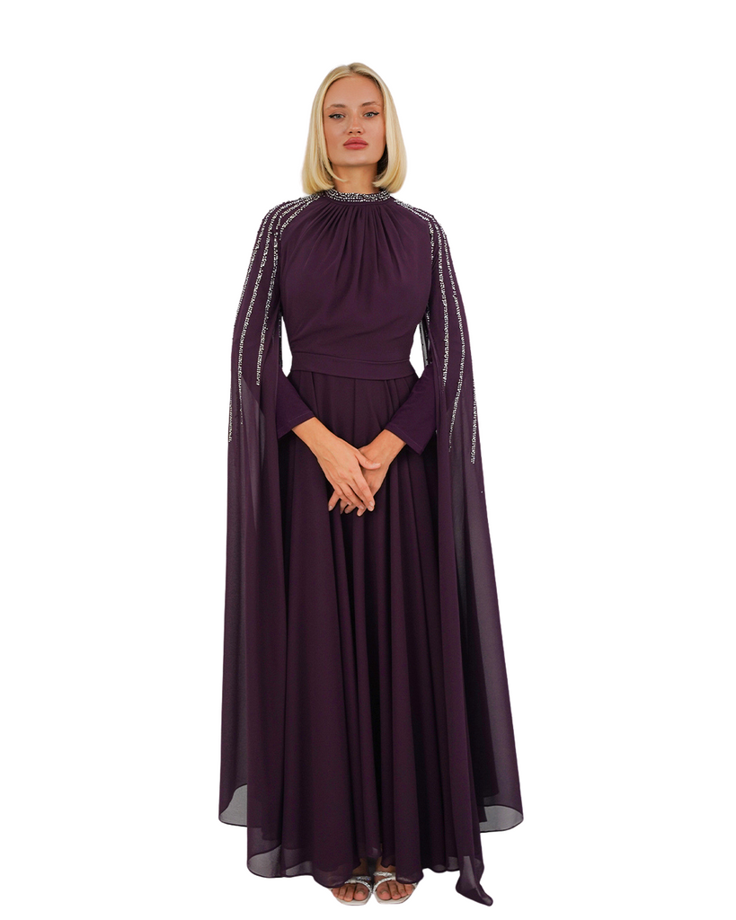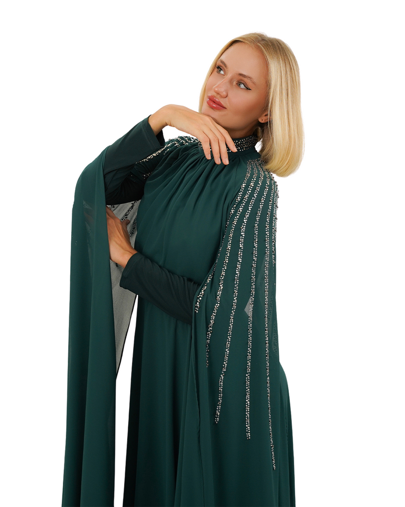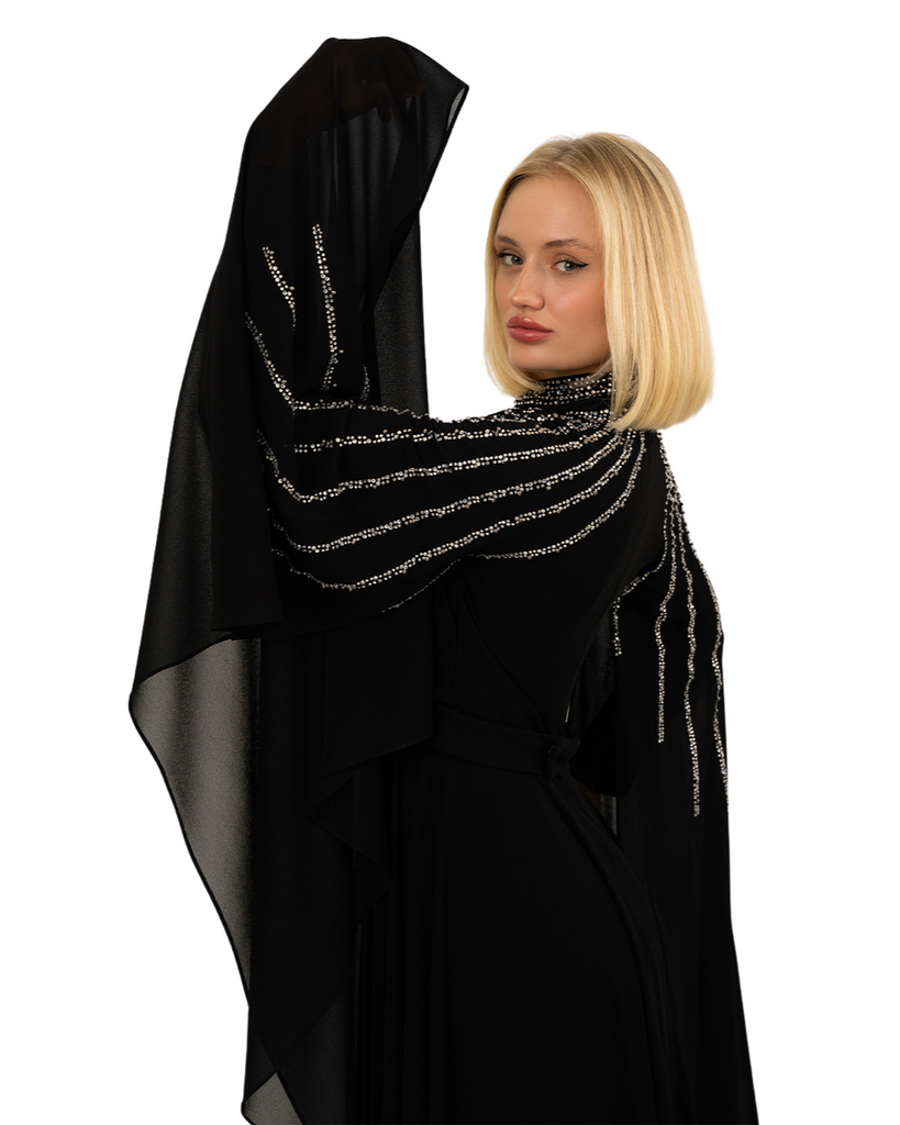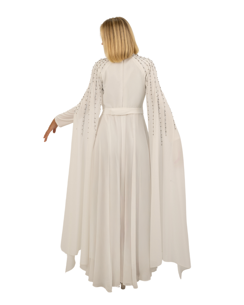 A feminine gown with luxurious details, made from soft chiffon that flows gracefully, and delicately embellished with shimmering rhinestones that add a magical touch to every move