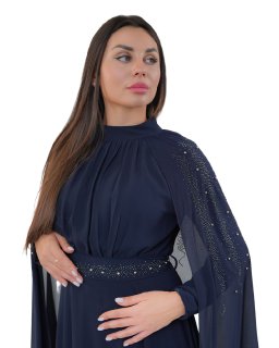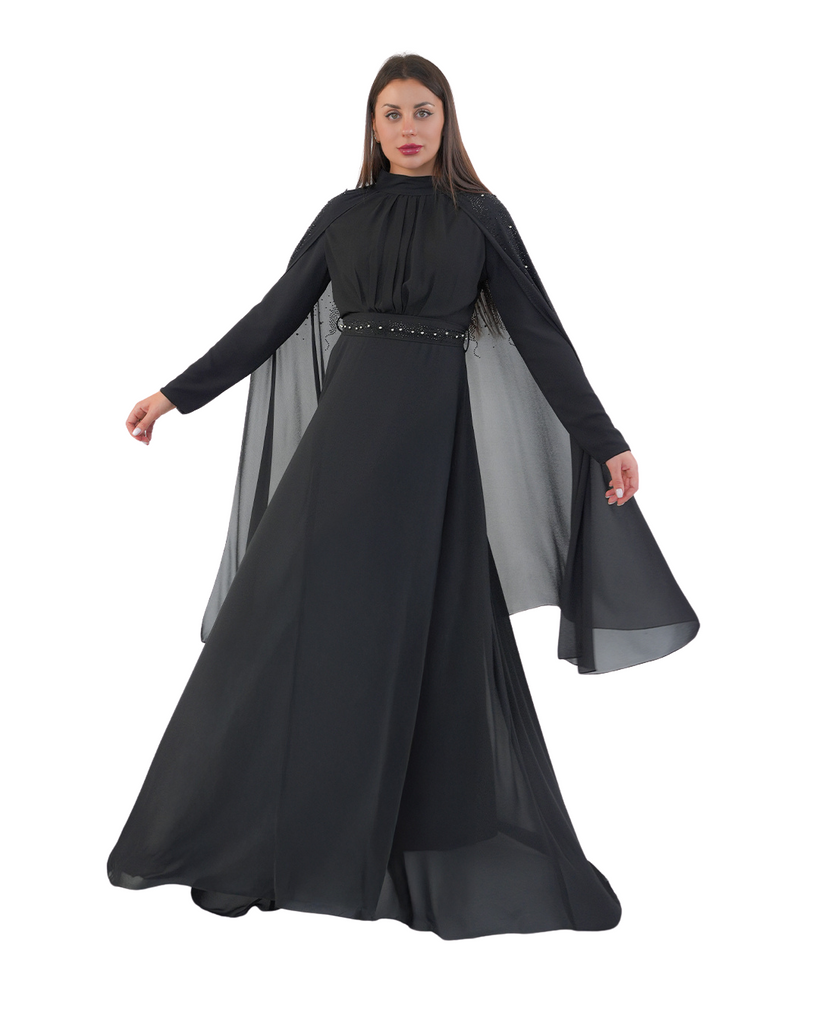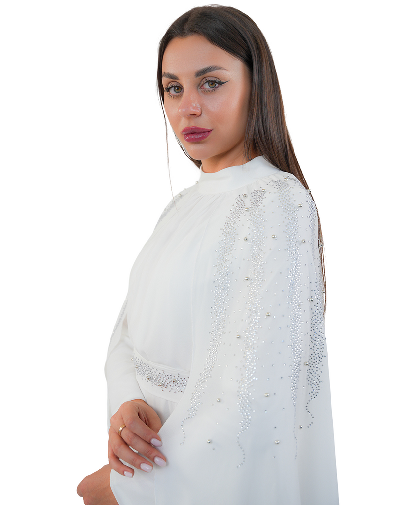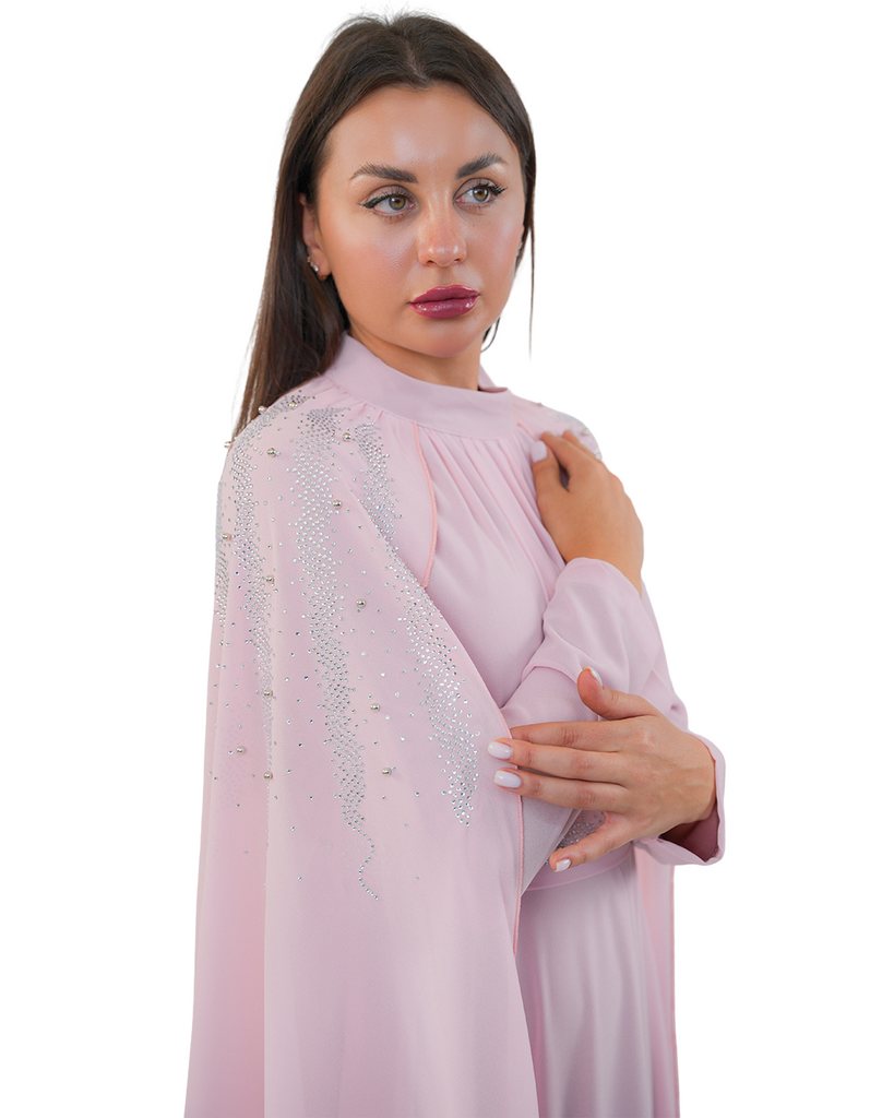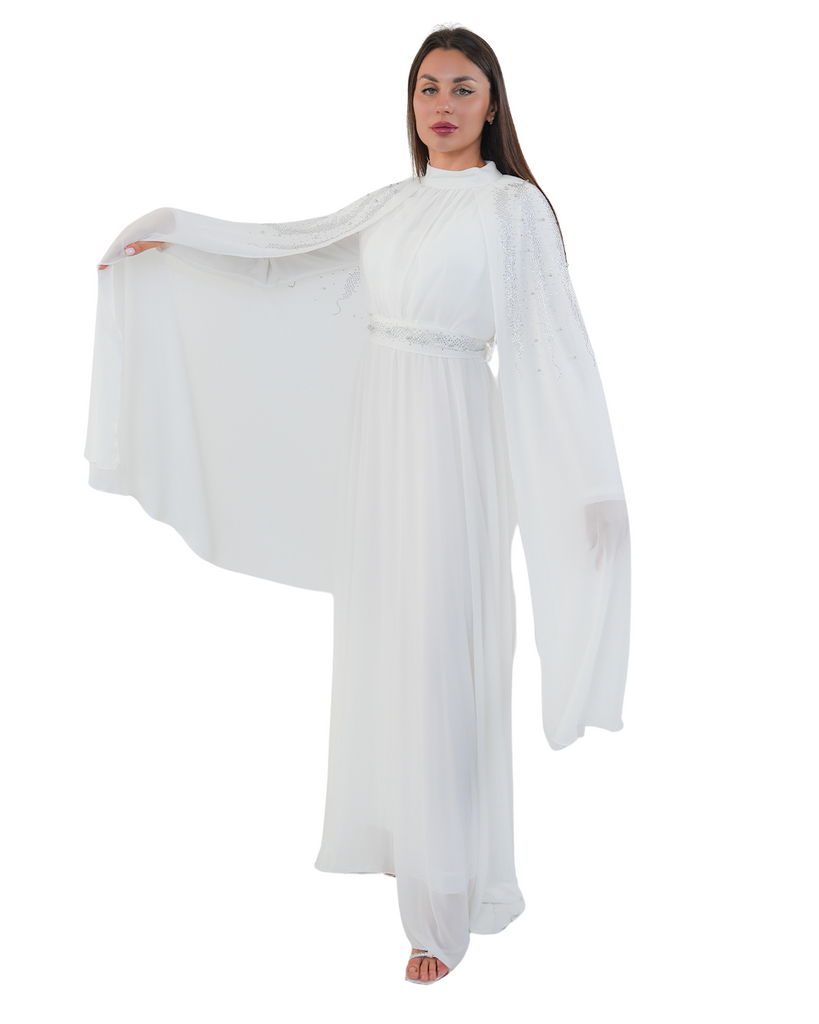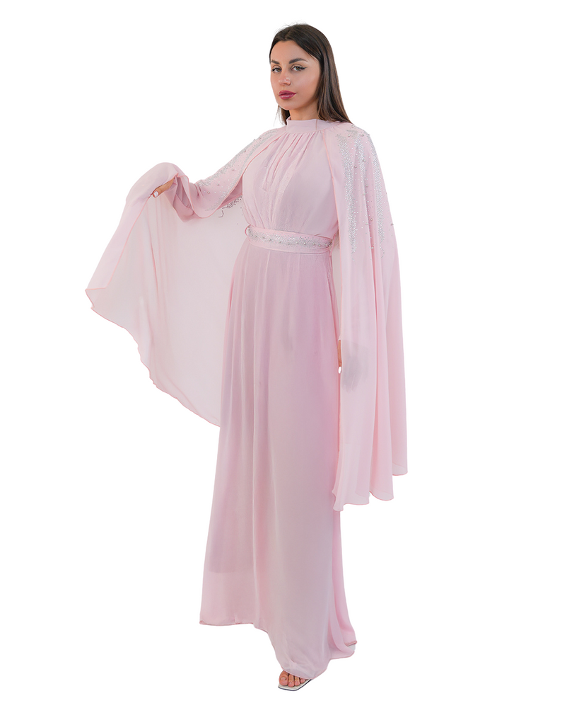 A feminine gown with luxurious details, made from soft chiffon that flows gracefully, and delicately embellished with shimmering rhinestones that add a magical touch to every move