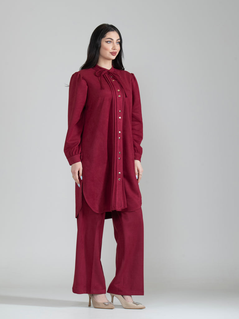 The set offers a modest, well-coordinated look with its comfortable cut and smooth, flowing fabric that adds quiet sophistication without overstatement.
