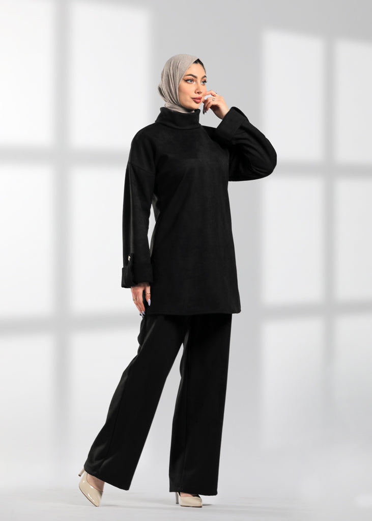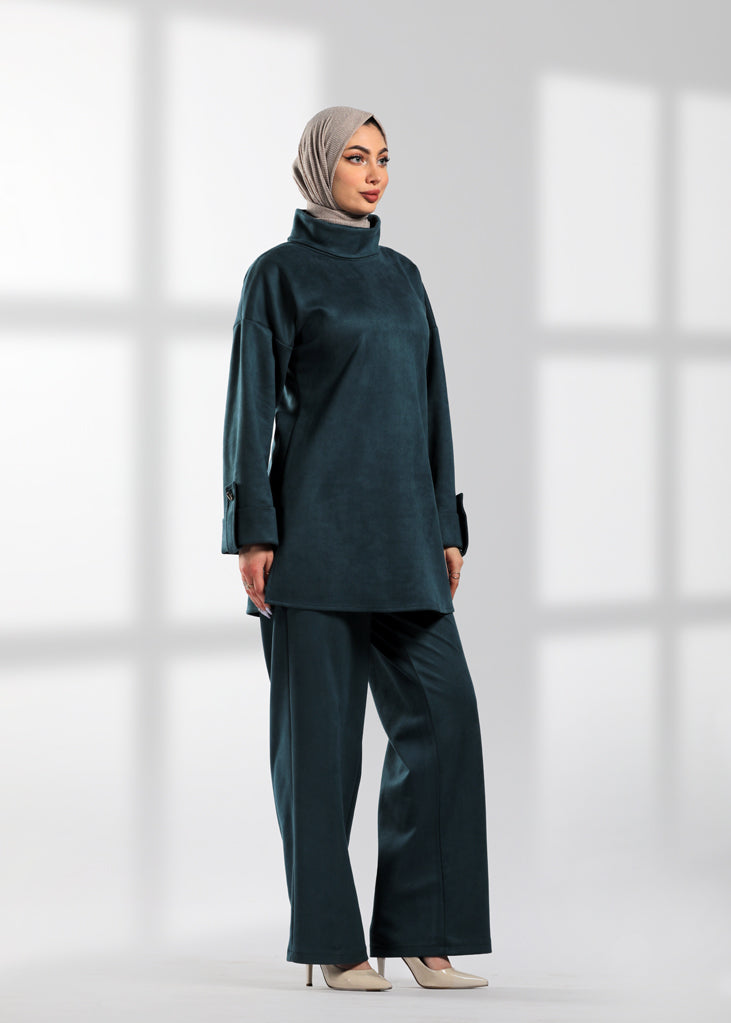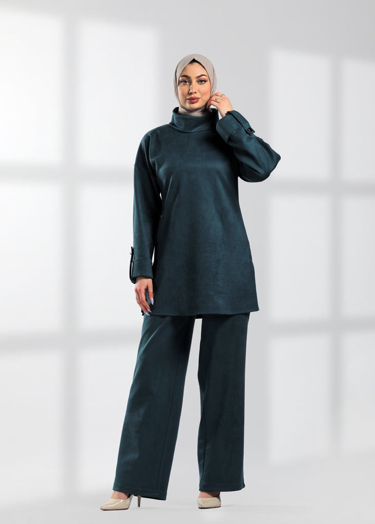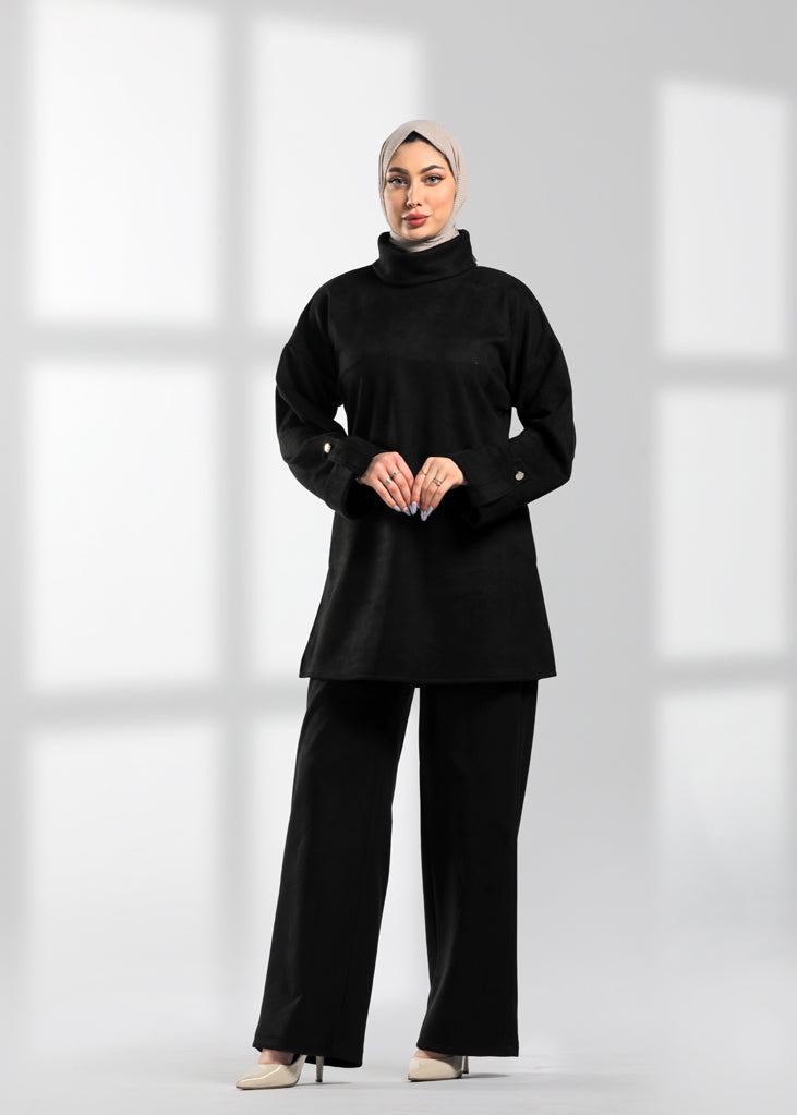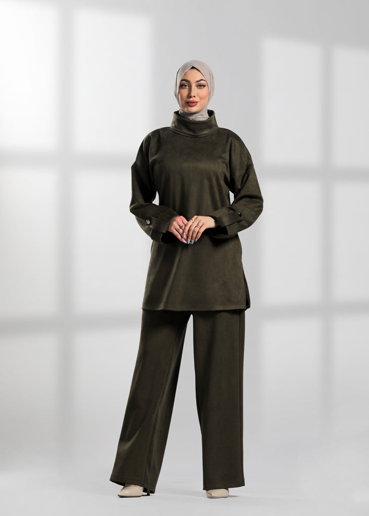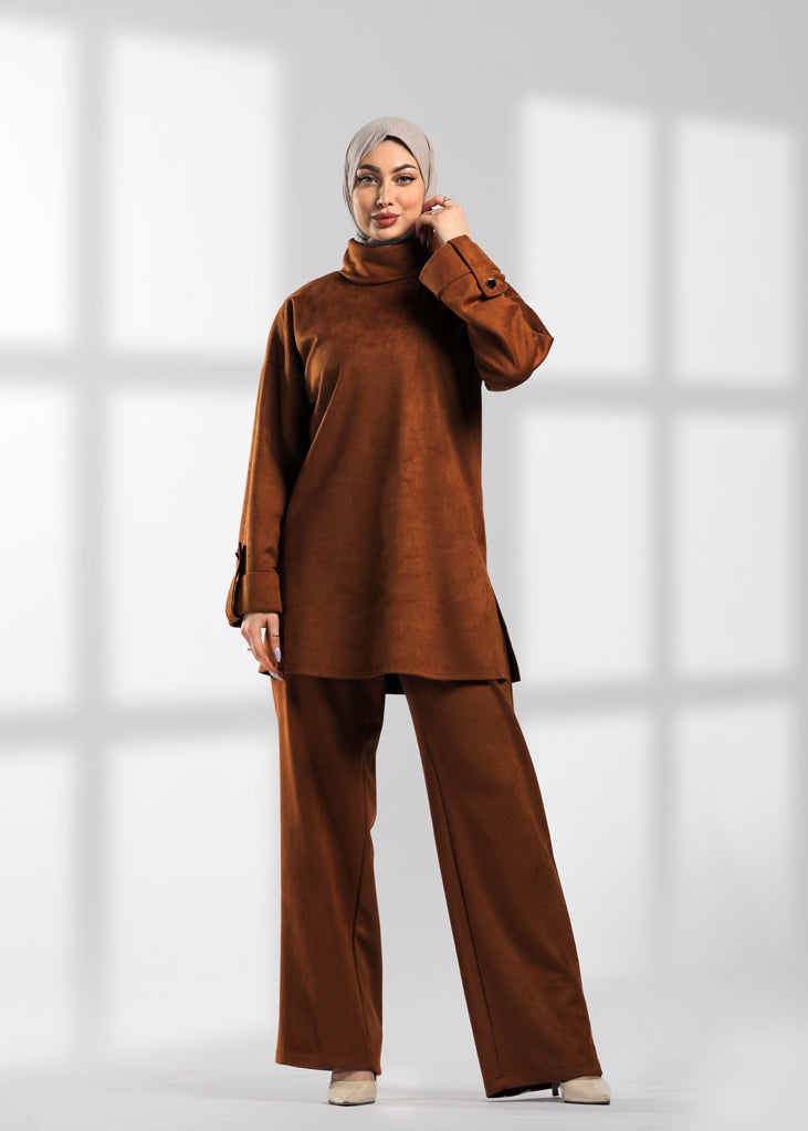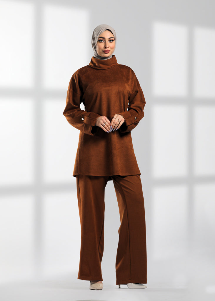 This set features a warm winter design that combines elegance and comfort, crafted from luxurious suede fabric that gives a soft, refined look suitable for cold weather. It is distinguished by its high neckline, adding a modern, stylish touch along with extra warmth, making it an ideal choice for chilly days.