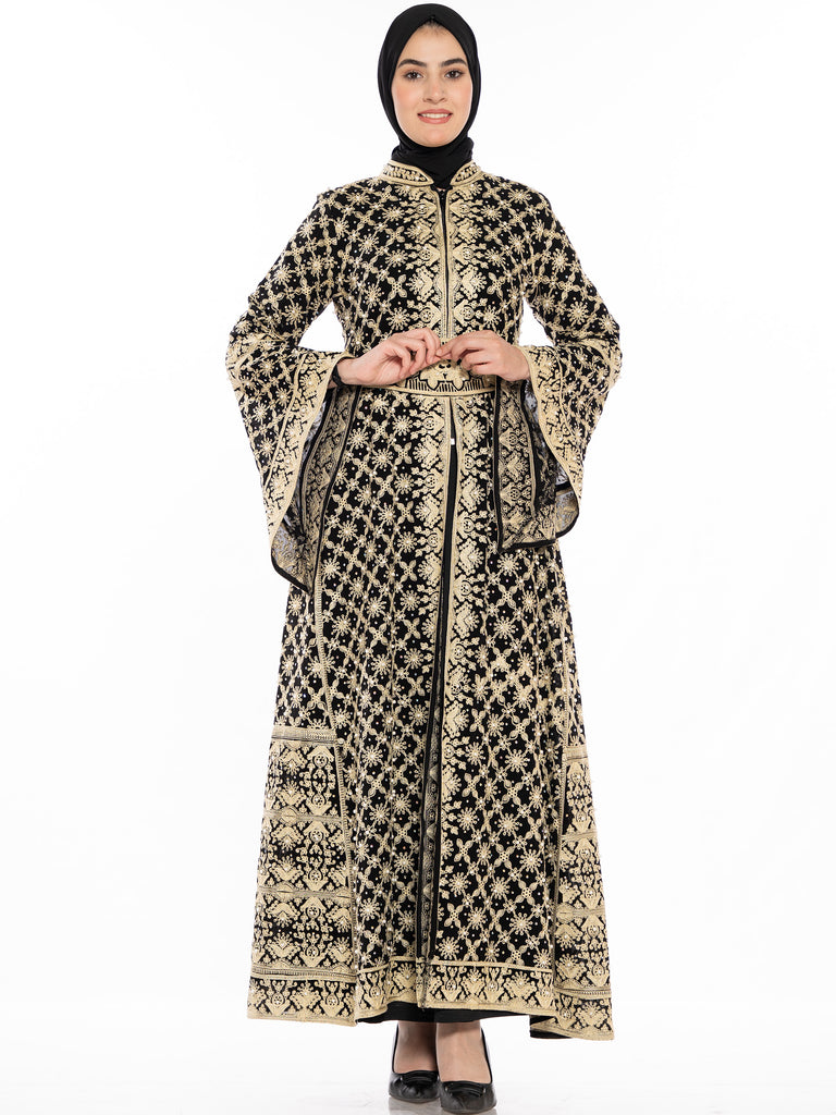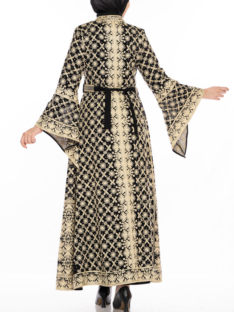An intricately embroidered caftan, the length of which reaches the ankle. Embroidery: the garment is decorated with delicate and intricate red embroidery, covering its entire surface except for the waist stretched vertically in front, which looks more or Less Ordinary and decorated. Embroidery is characterized by a symmetrical and attractive pattern, which gives it a touch of art and beauty. Colors: the dress is available in black and gold, the base fabric is black, and the embroidery is gold, which provides a strong and striking contrast. Sleeves: long sleeves, completely covered with embroidery, complementing the overall design of the dress.