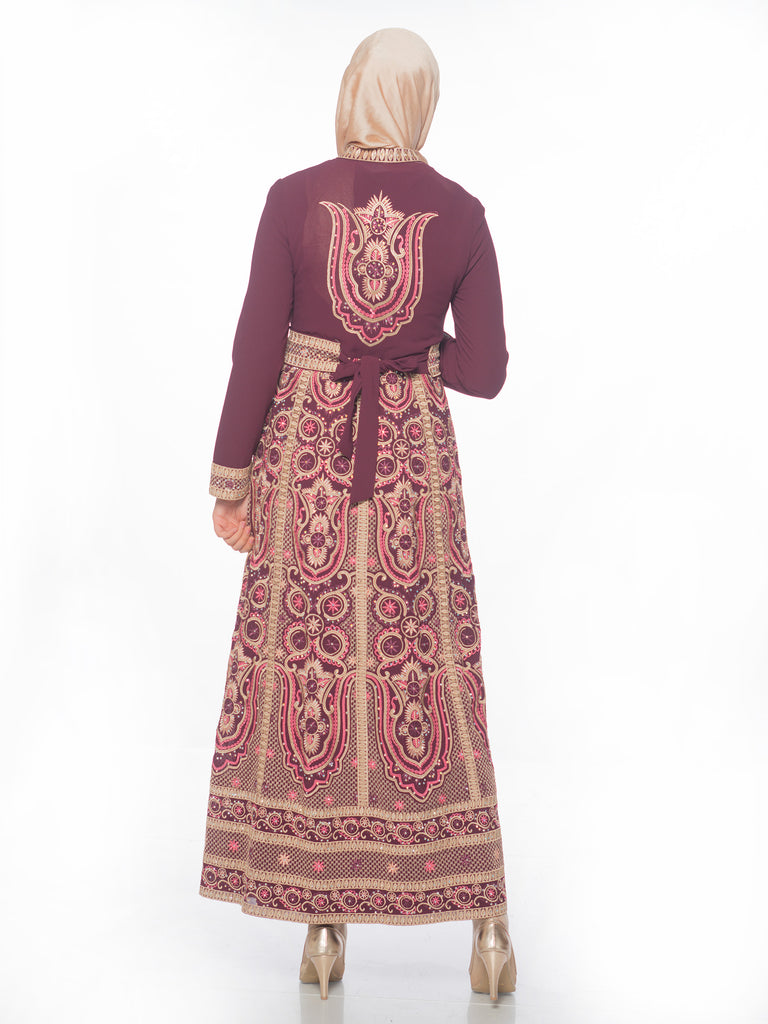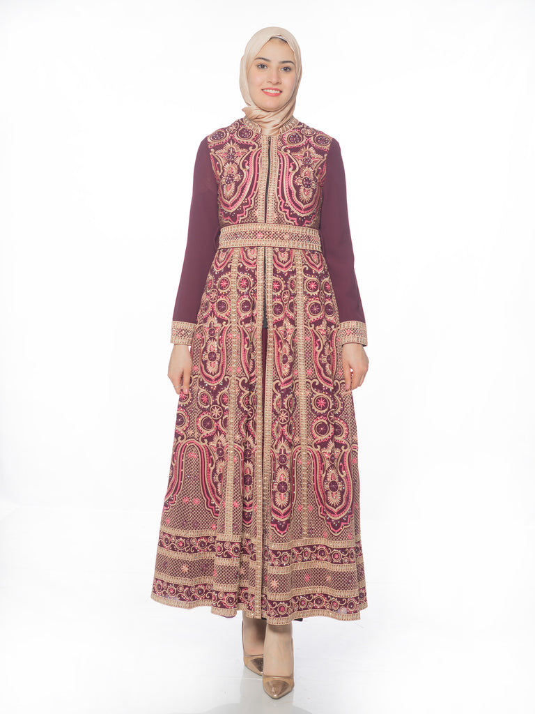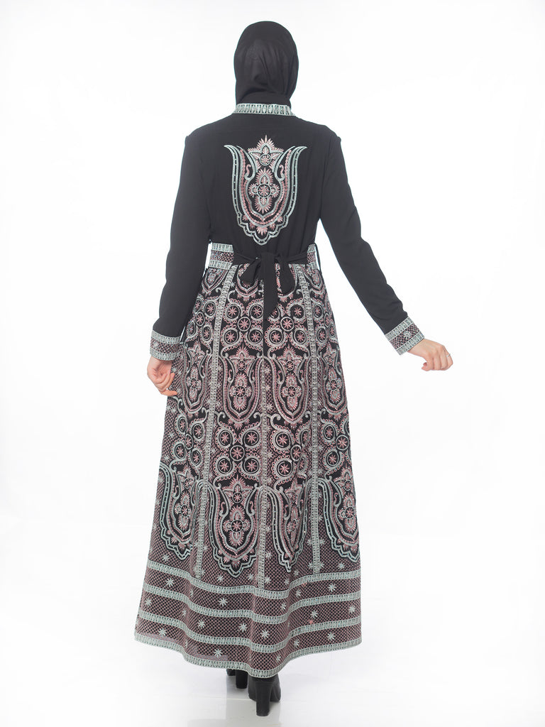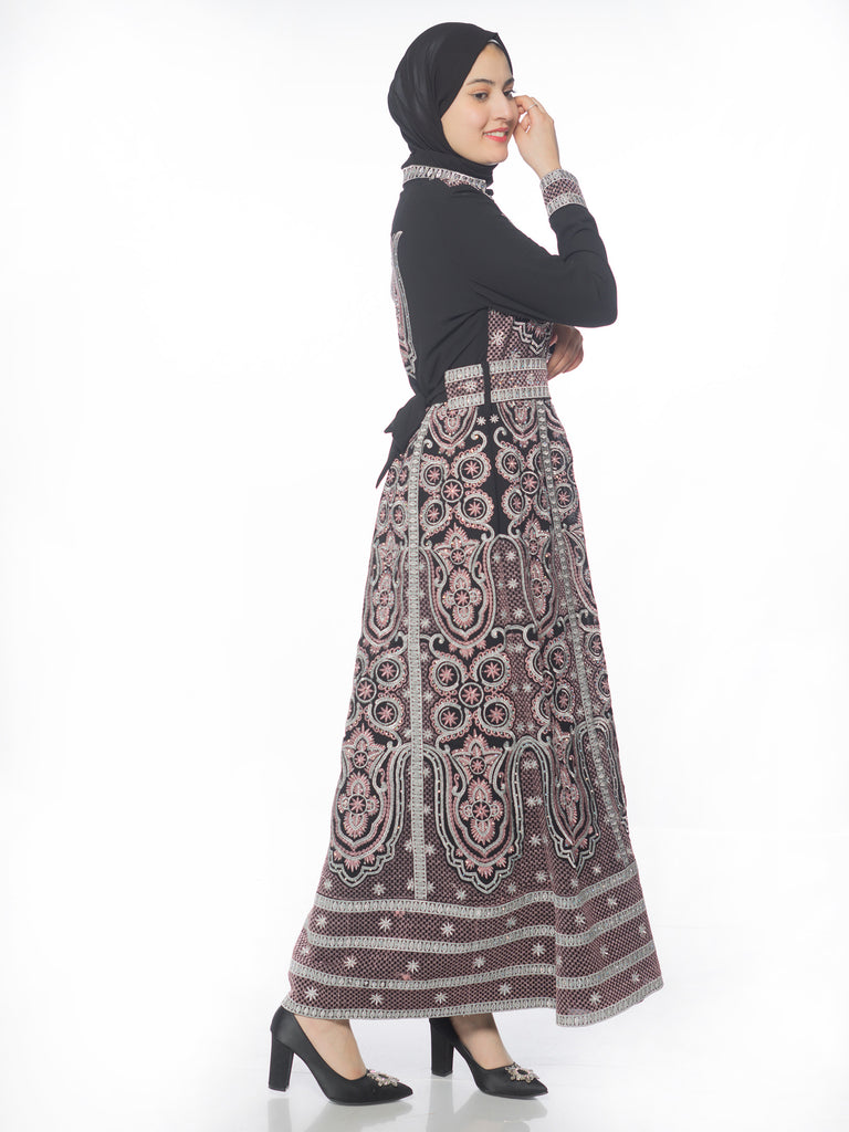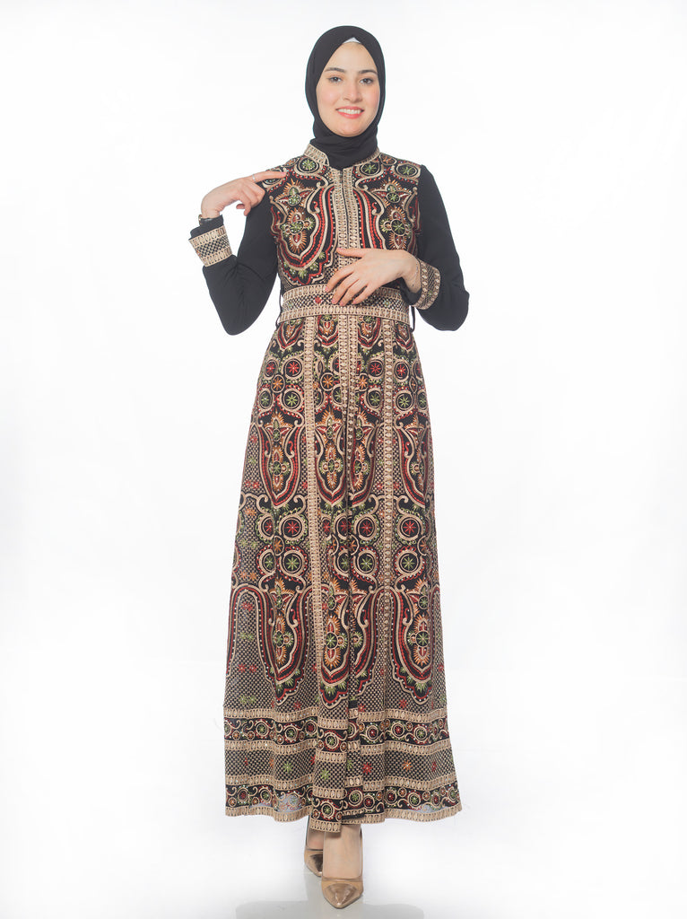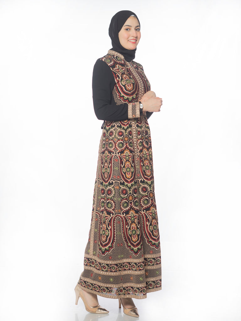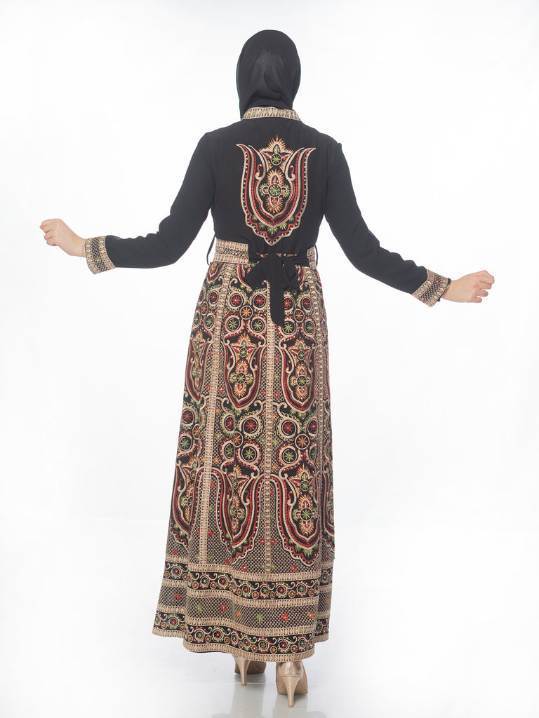 a beautifully designed traditional dress. The attire is adorned with intricate patterns and designs, exuding an aura of elegance and cultural richness. The dress is long, reaching down to the ankles, and features a black upper part with long sleeves and a high neckline. The dress is contrasted by white and red hues that form symmetrical designs on the lower part