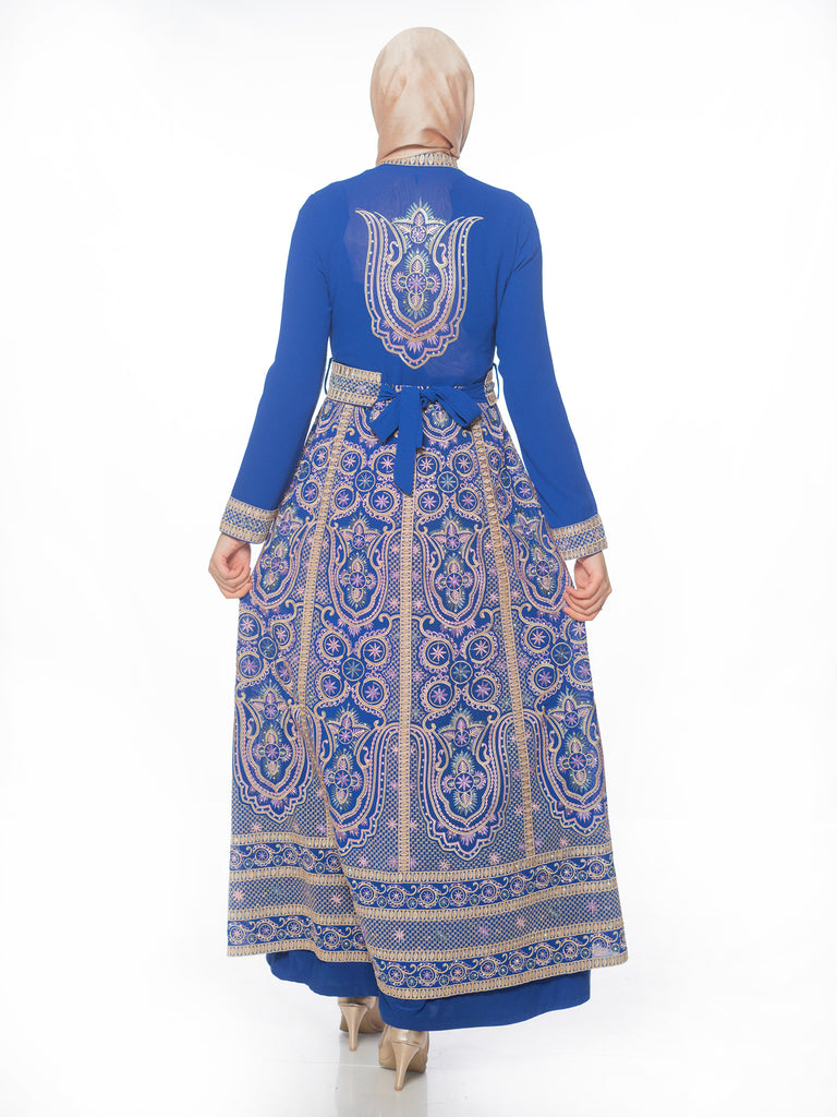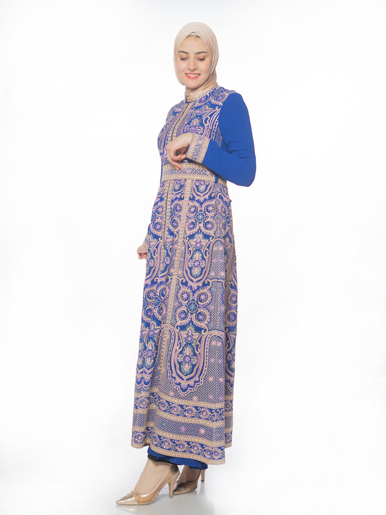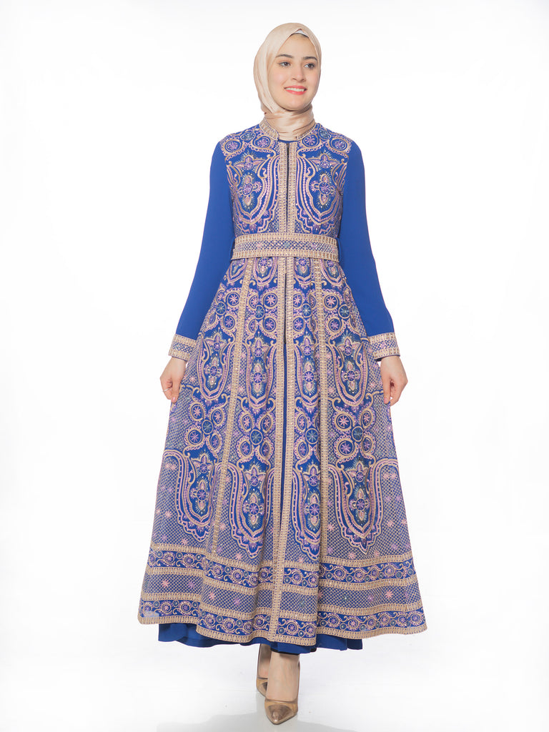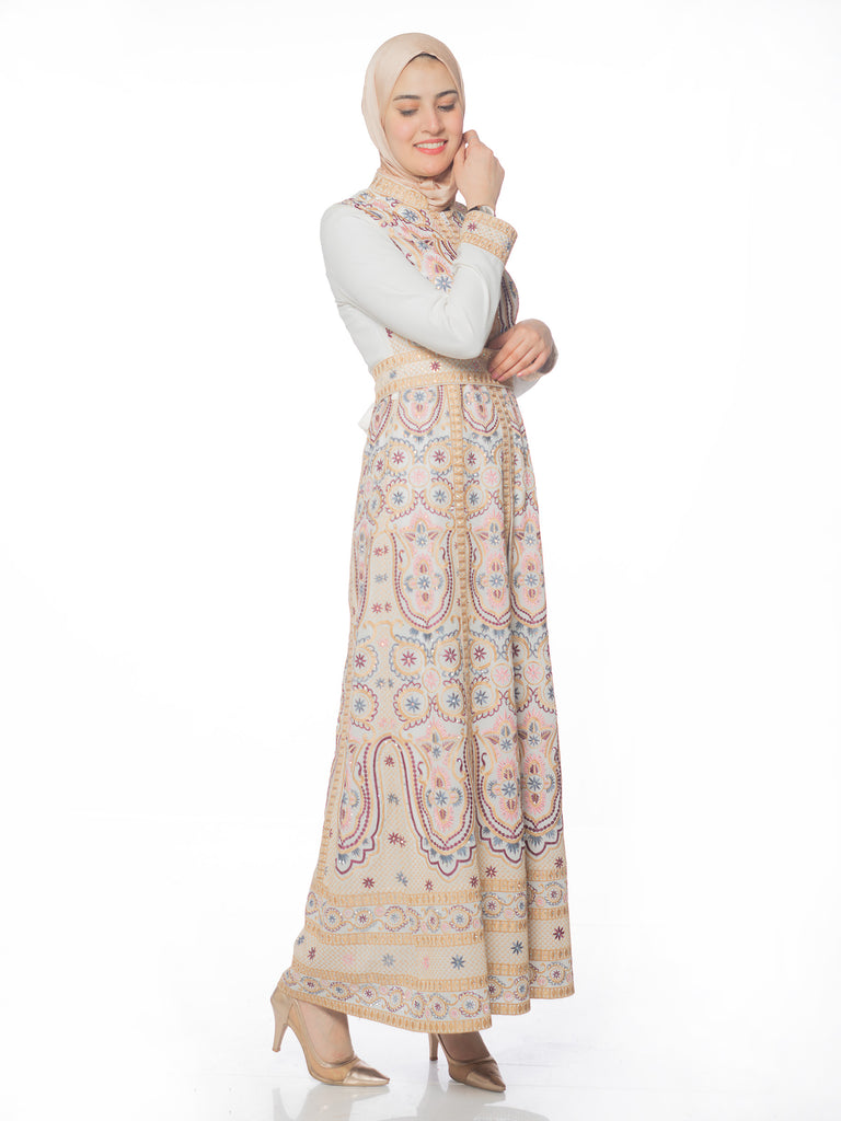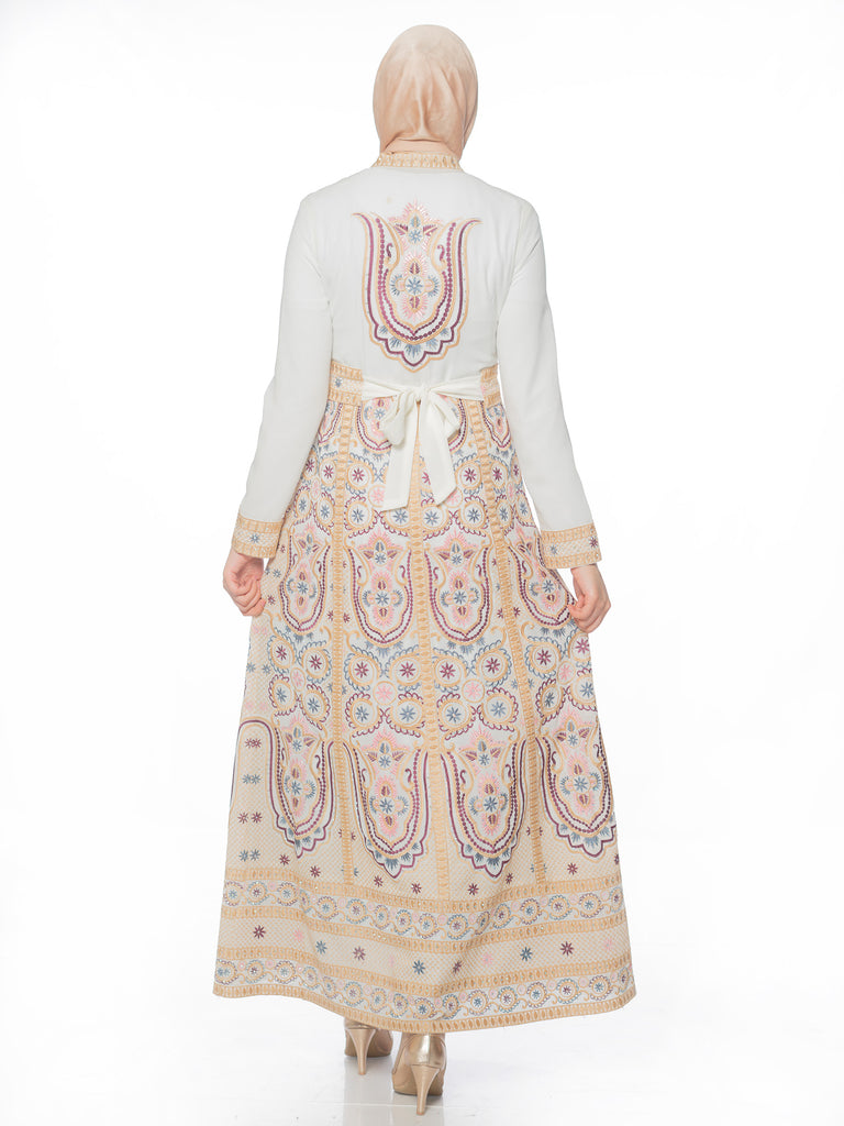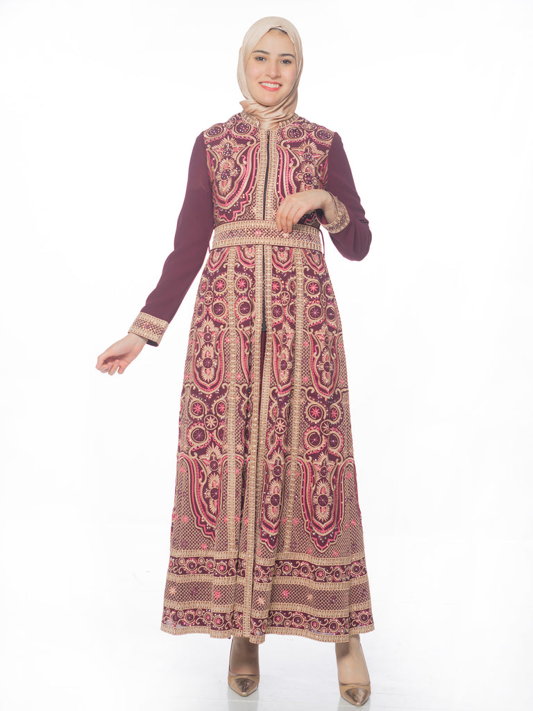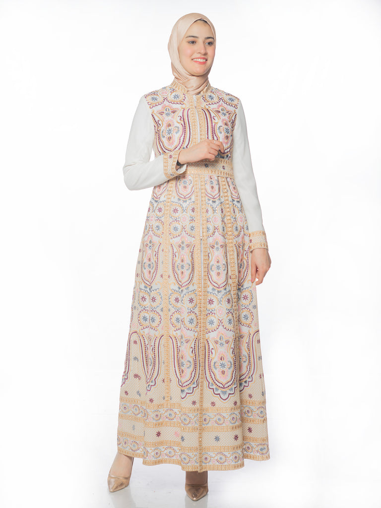 a beautifully designed traditional dress. The attire is adorned with intricate patterns and designs, exuding an aura of elegance and cultural richness. The dress is long, reaching down to the ankles, and features a black upper part with long sleeves and a high neckline. The dress is contrasted by white and red hues that form symmetrical designs on the lower part