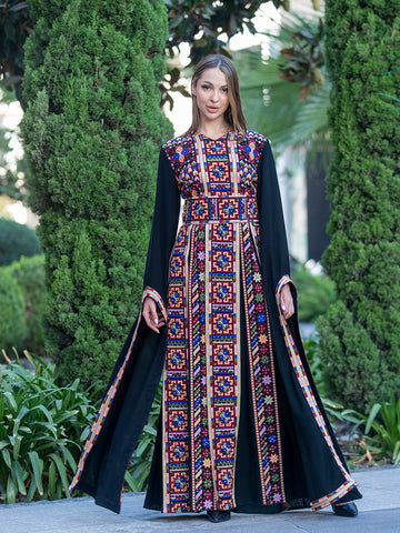 A luxurious dress with rich, heavy embroidery adorned with sparkling rhinestones, adding a unique touch of shine and elegance.