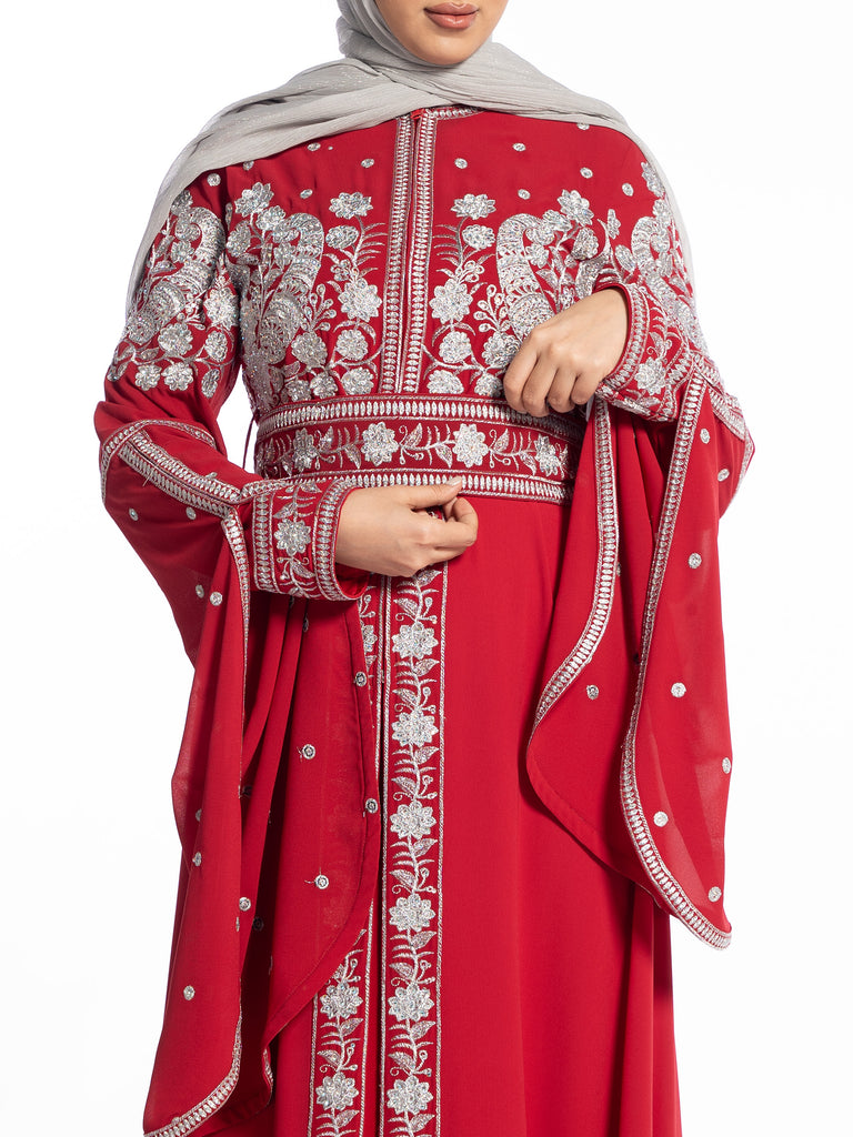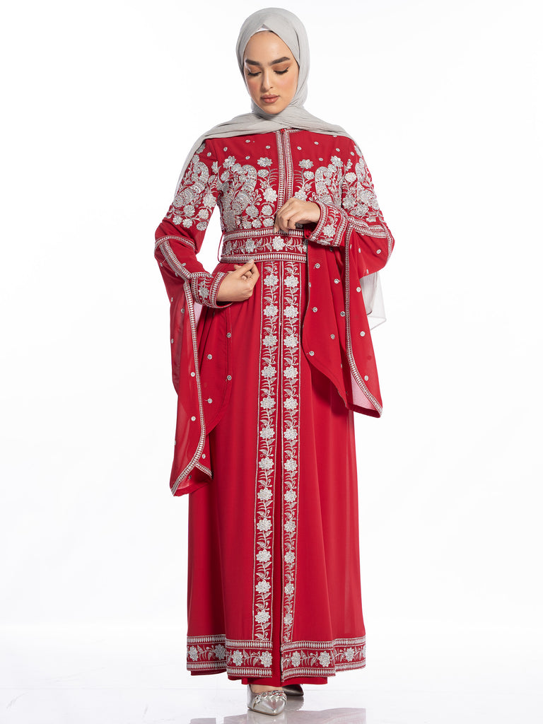 This dress is a wonderful piece of art that displays intricate designs and patterns. The dress is available in several colors, including red, pink and white. The dress consists of two pieces: the top piece and the bottom piece. The upper piece is red, pink or white, decorated with colorful embroidery on the chest and sleeves. The lower piece has a matching color to the upper one, which is a long and wide skirt. The dress has details embroidered in harmonious colors, forming floral patterns and geometric shapes. Embroidery is concentrated on the sleeves and the front of the dress. The dress is full-length, and gives the wearer an elegant and sparkling look.