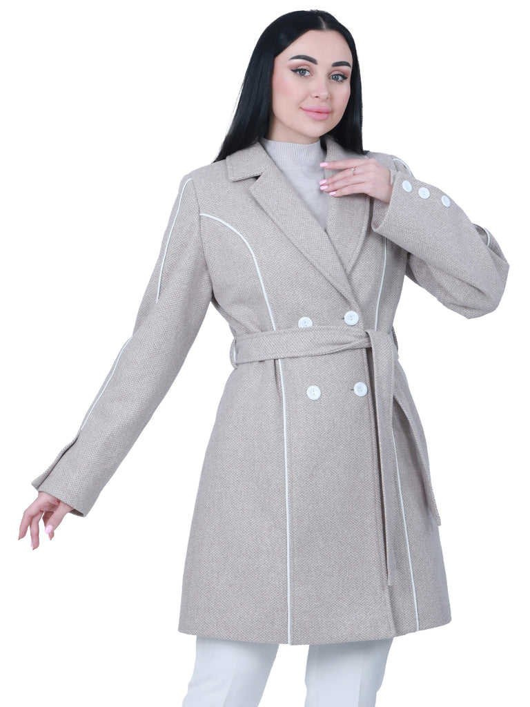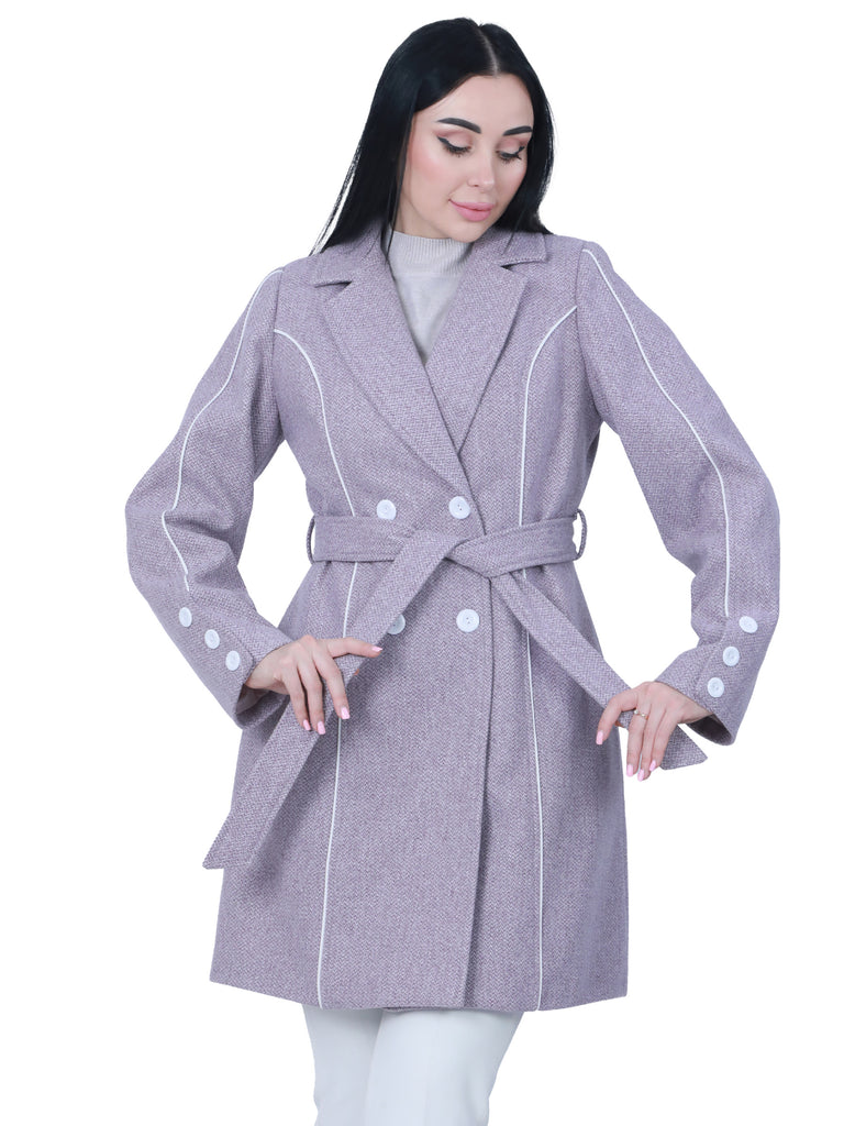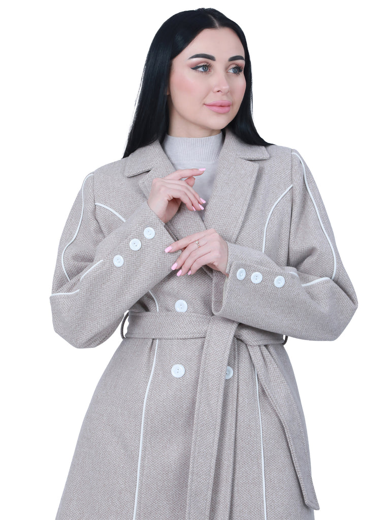 What catches the eye in this design are the prominent white buttons that add a bold and modern touch, creating an elegant contrast with the fabric color, making it a unique piece in your winter wardrobe.
