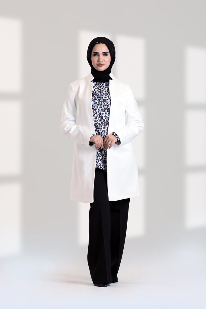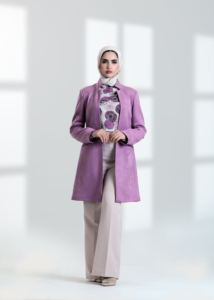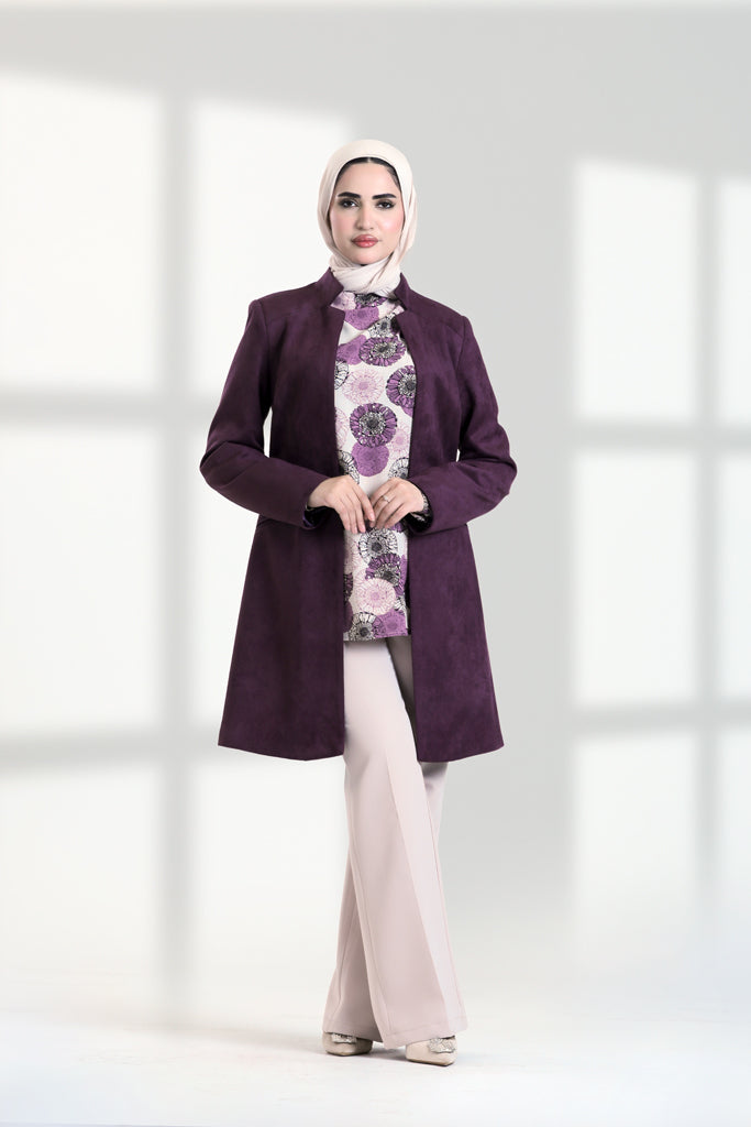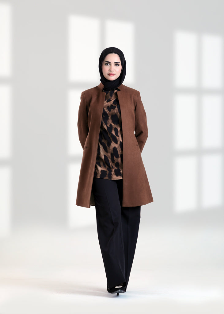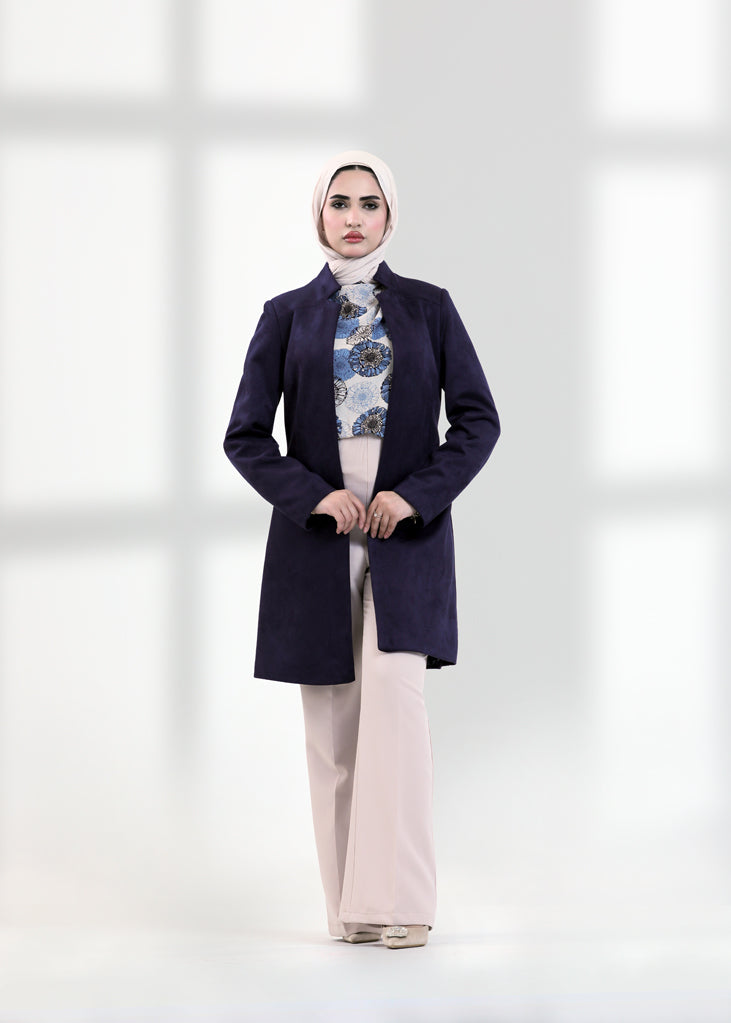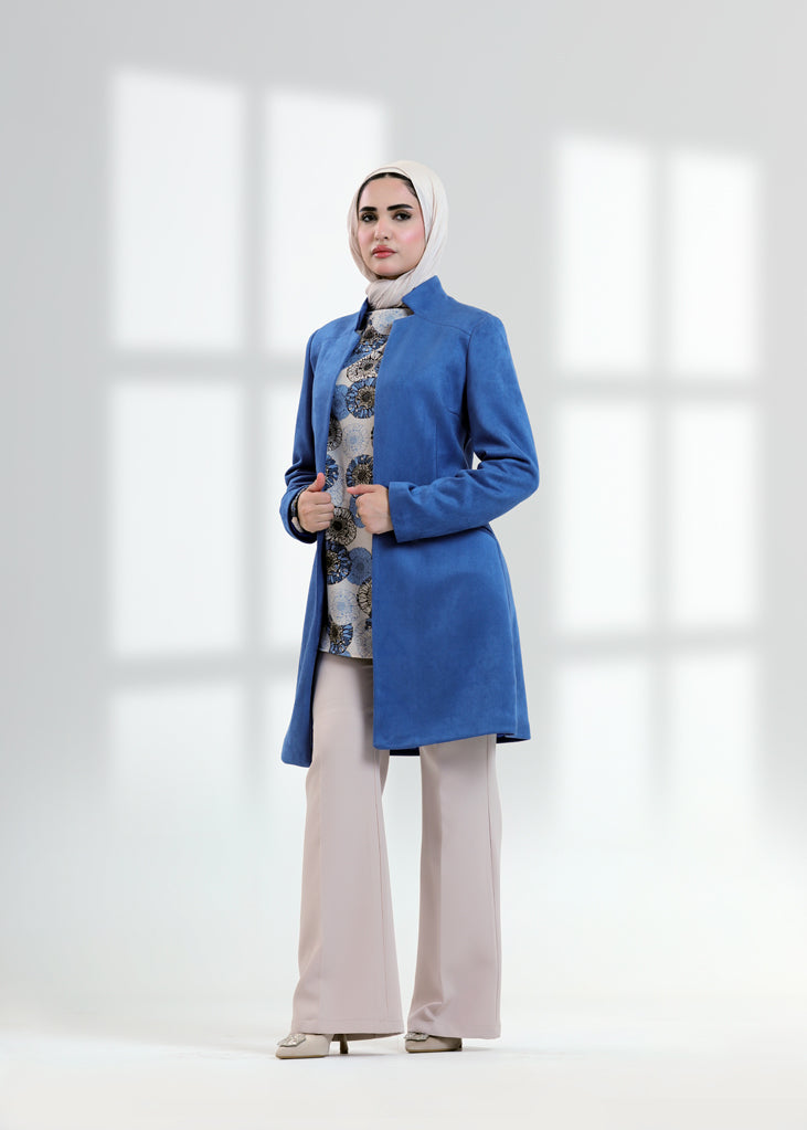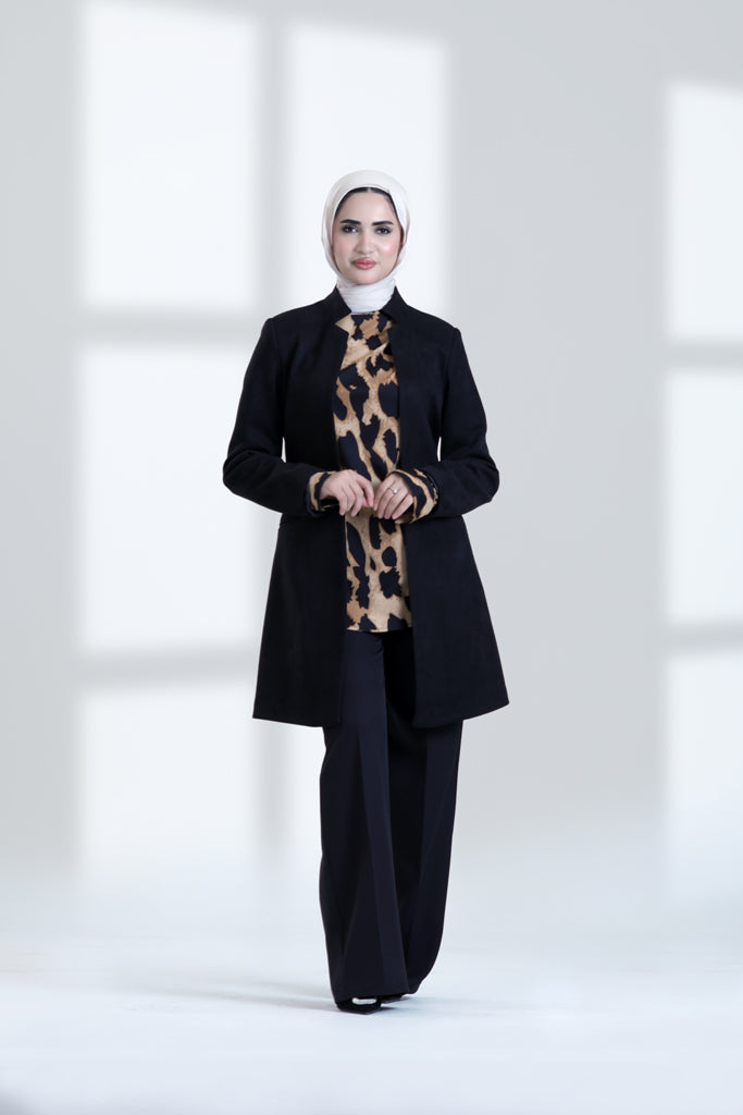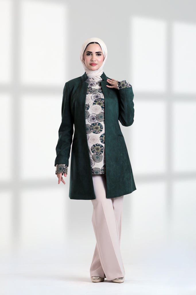 The winter jacket paired with a blouse offers an elegant look that combines warmth and sophistication. It features a unique design and modern cut that add a touch of femininity and style, while its distinctive colors provide a chic appearance suitable for various winter occasions.