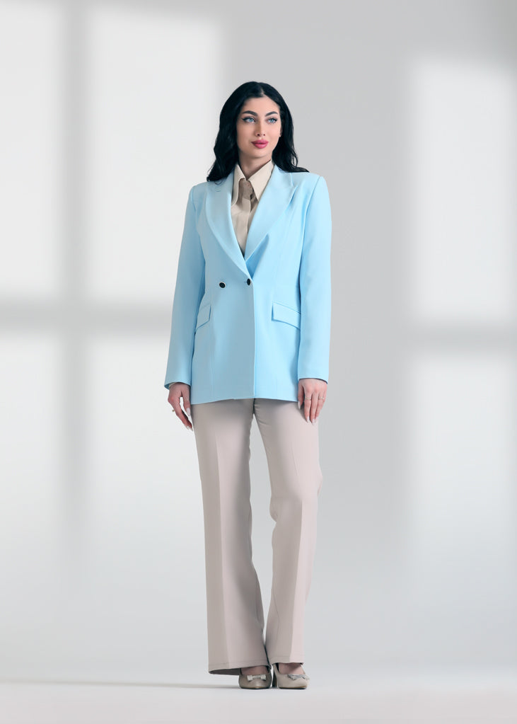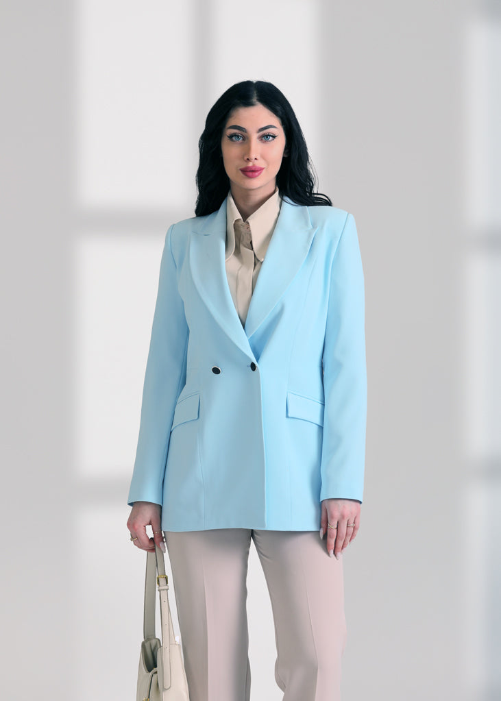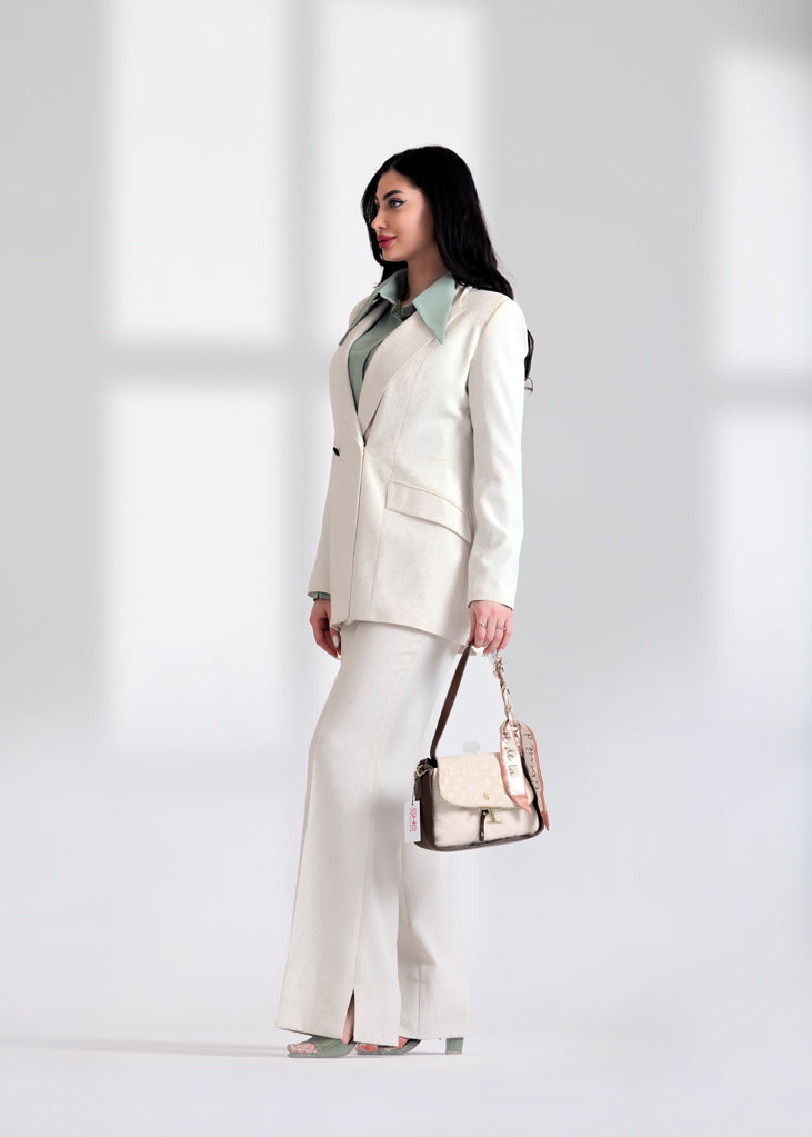 Blazer with delicate pocket detailing, adorned with sparkling rhinestones, offering a chic and elegant touch. Paired with a basic blouse for a balanced look that combines classic elegance with a modern twist. Perfect for formal occasions or sophisticated everyday outfits.