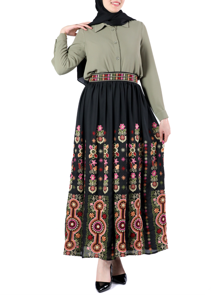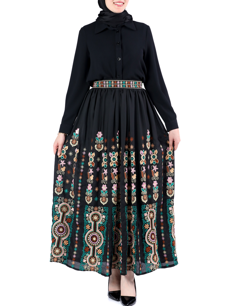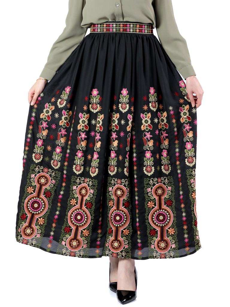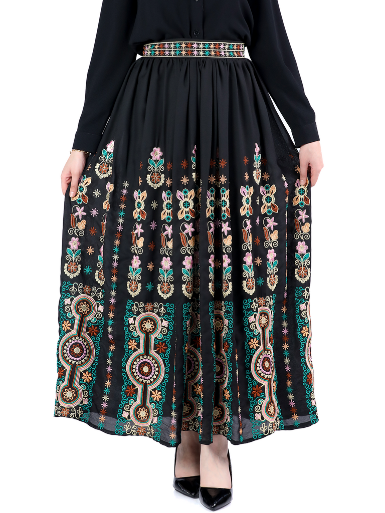 This skirt is a wonderful piece of art that combines colors and details. The skirt is black, decorated with colorful and intricate embroidery. The embroidery contains various floral and geometric patterns, and displays a mixture of colors such as red, green, yellow, white and blue. The designs are arranged symmetrically, which contributes to a beautiful and harmonious appearance. The skirt is full length, made of smooth flowing fabric.
