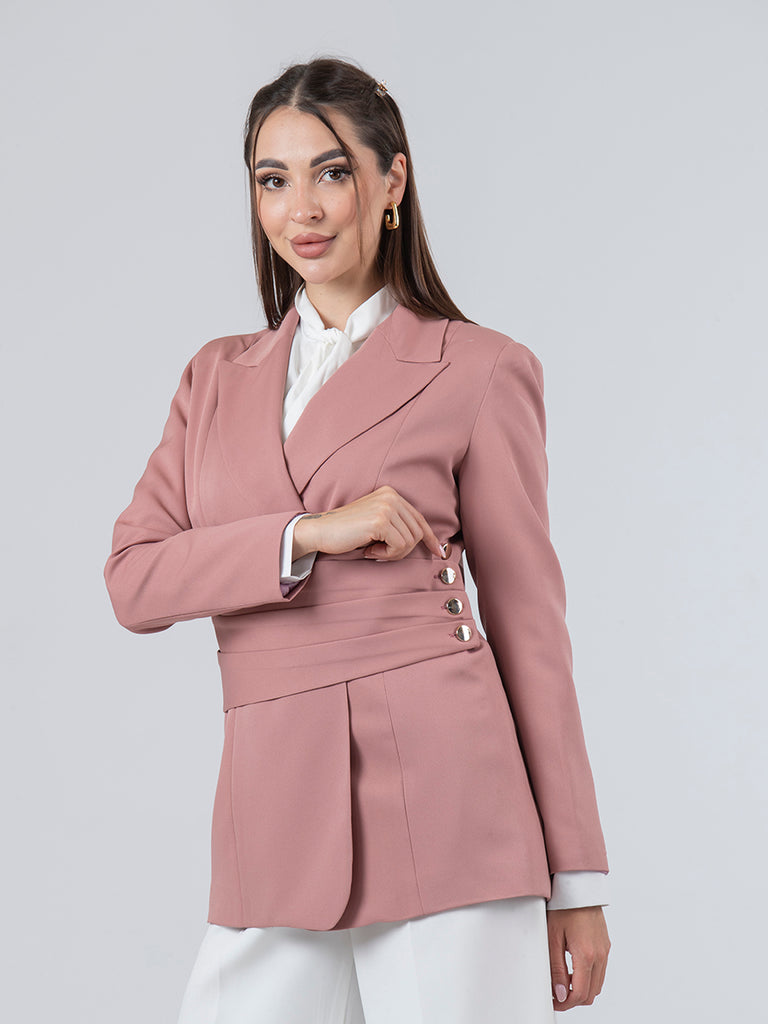 A stylish blazer that stands out with its distinctive decorative buttons, adding a touch of sophistication and charm.