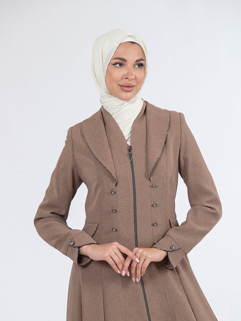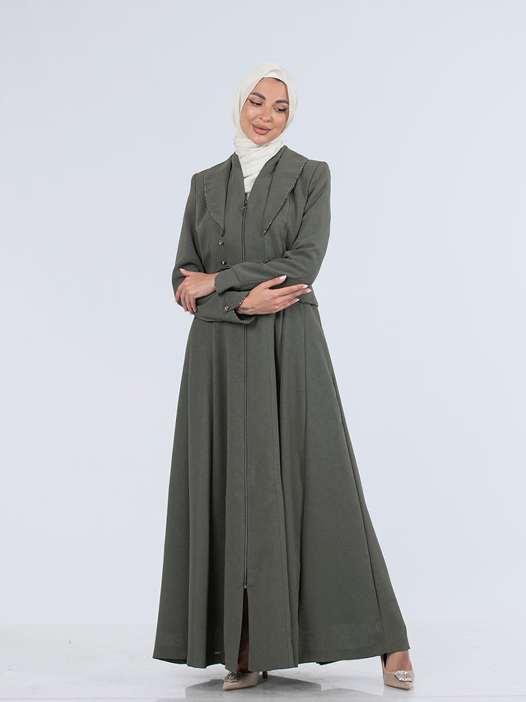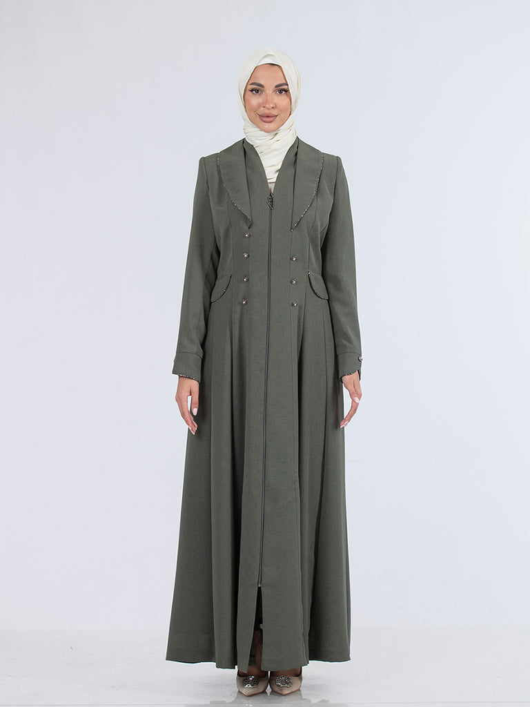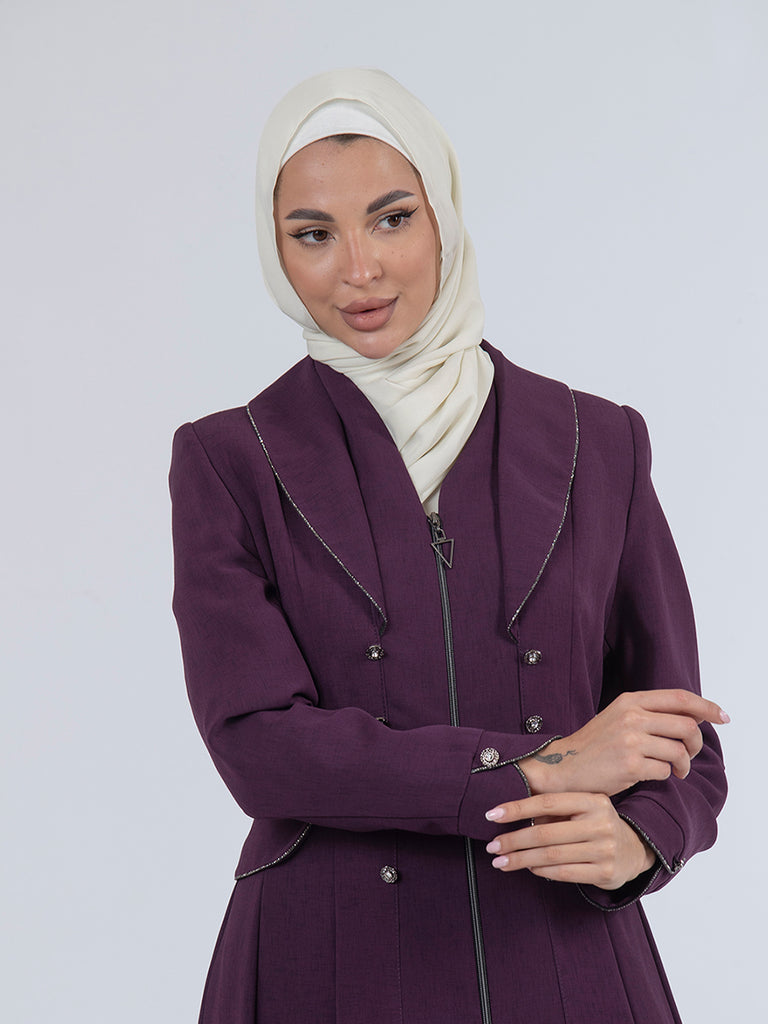 An elegant jilbab with a unique modern cut, adorned with sparkling rhinestones and stylish buttons, featuring a practical zipper that adds both beauty and functionality. Perfect for a modest and graceful look suitable for any occasion.