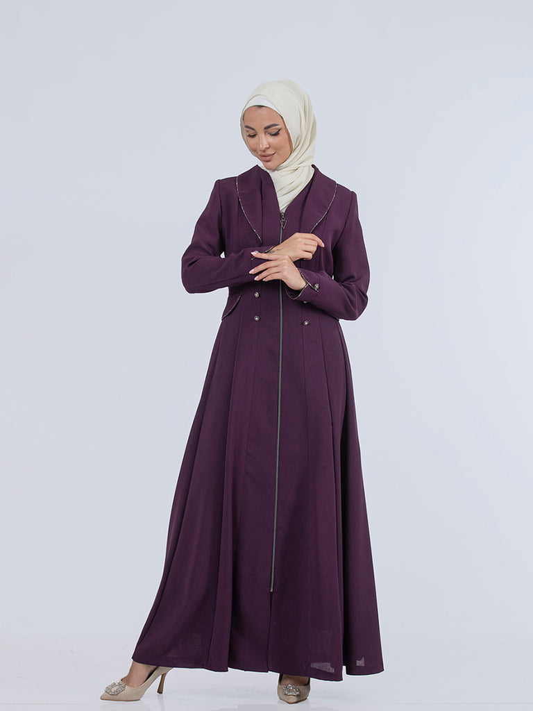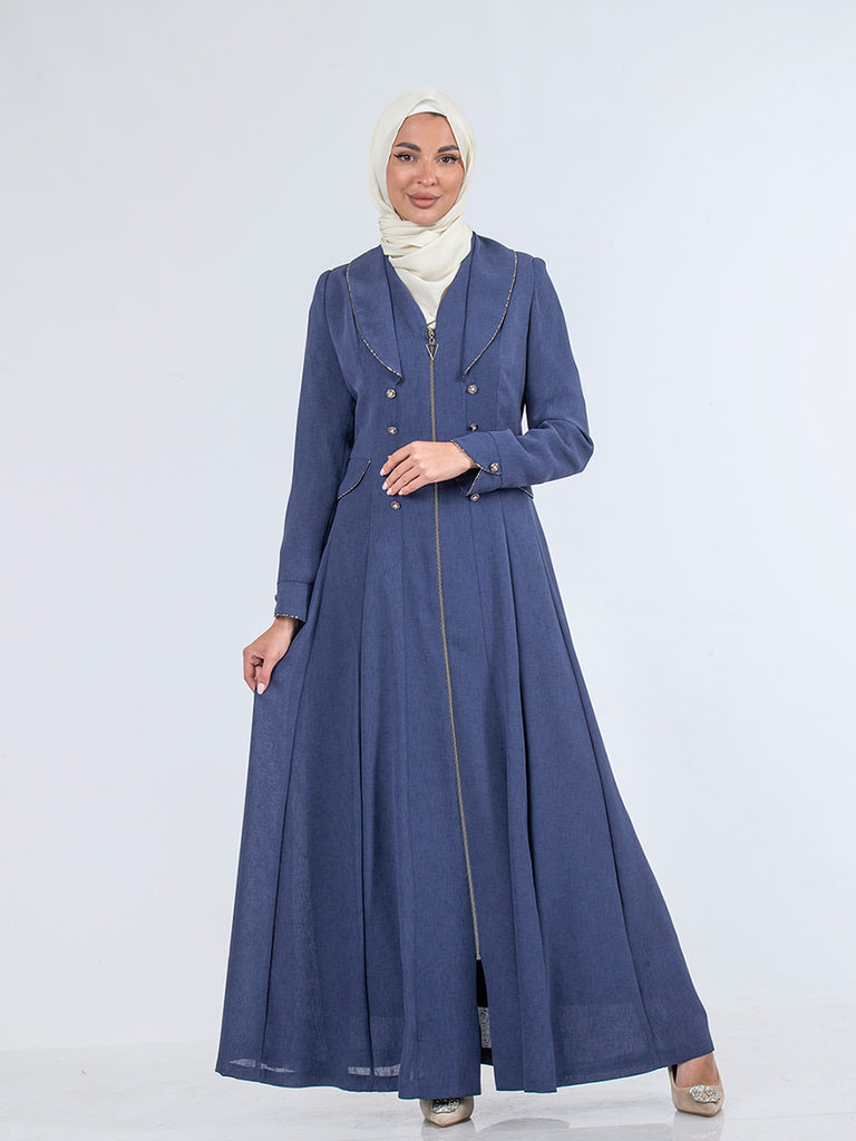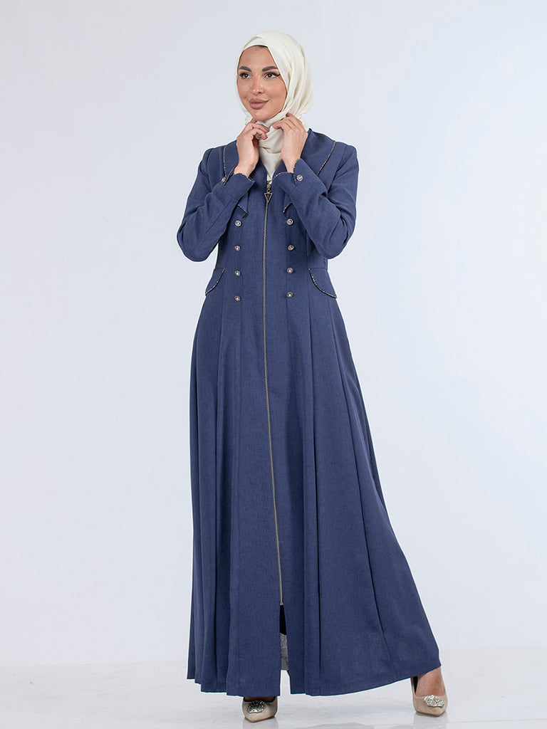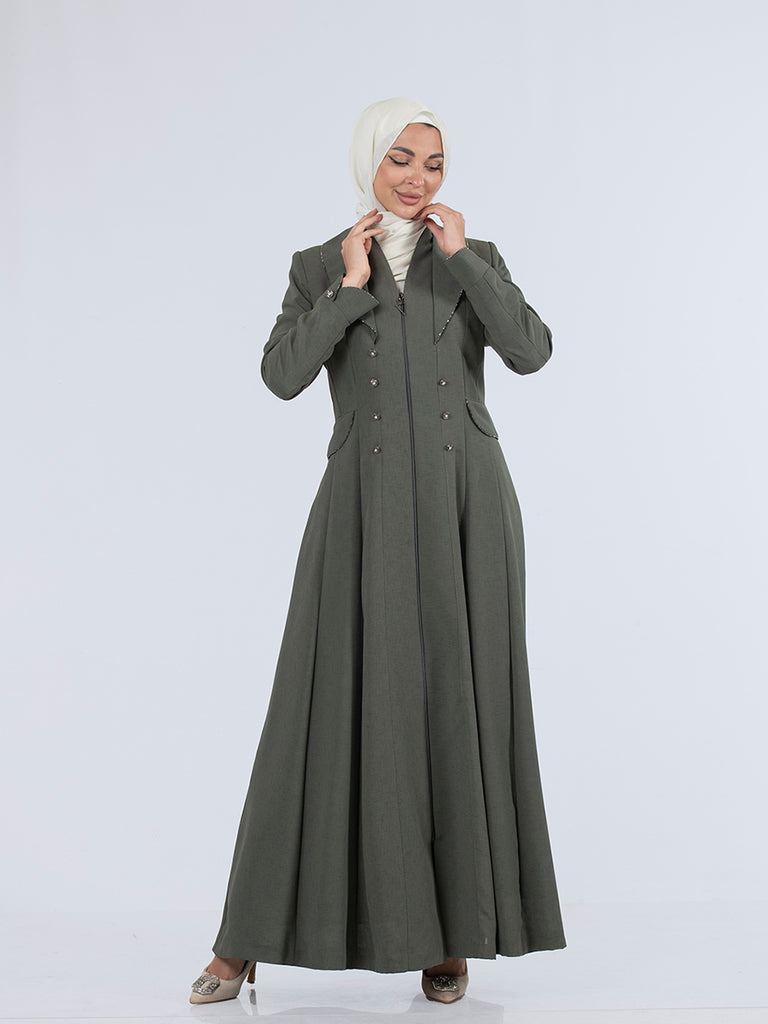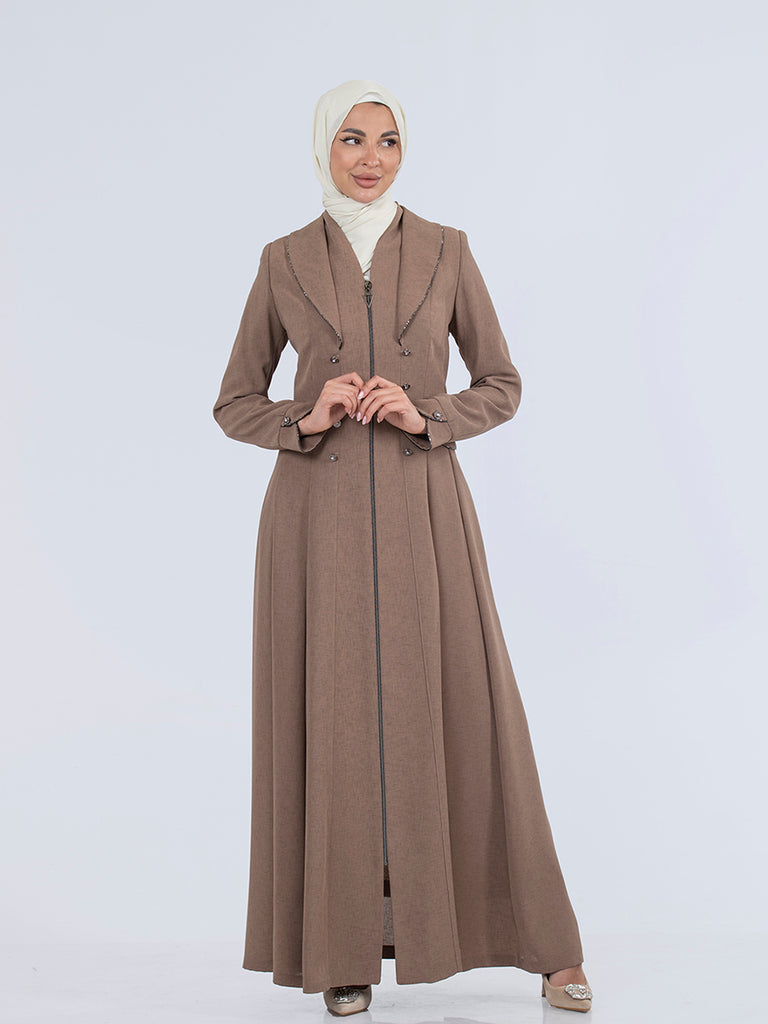 An elegant jilbab with a unique modern cut, adorned with sparkling rhinestones and stylish buttons, featuring a practical zipper that adds both beauty and functionality. Perfect for a modest and graceful look suitable for any occasion.
