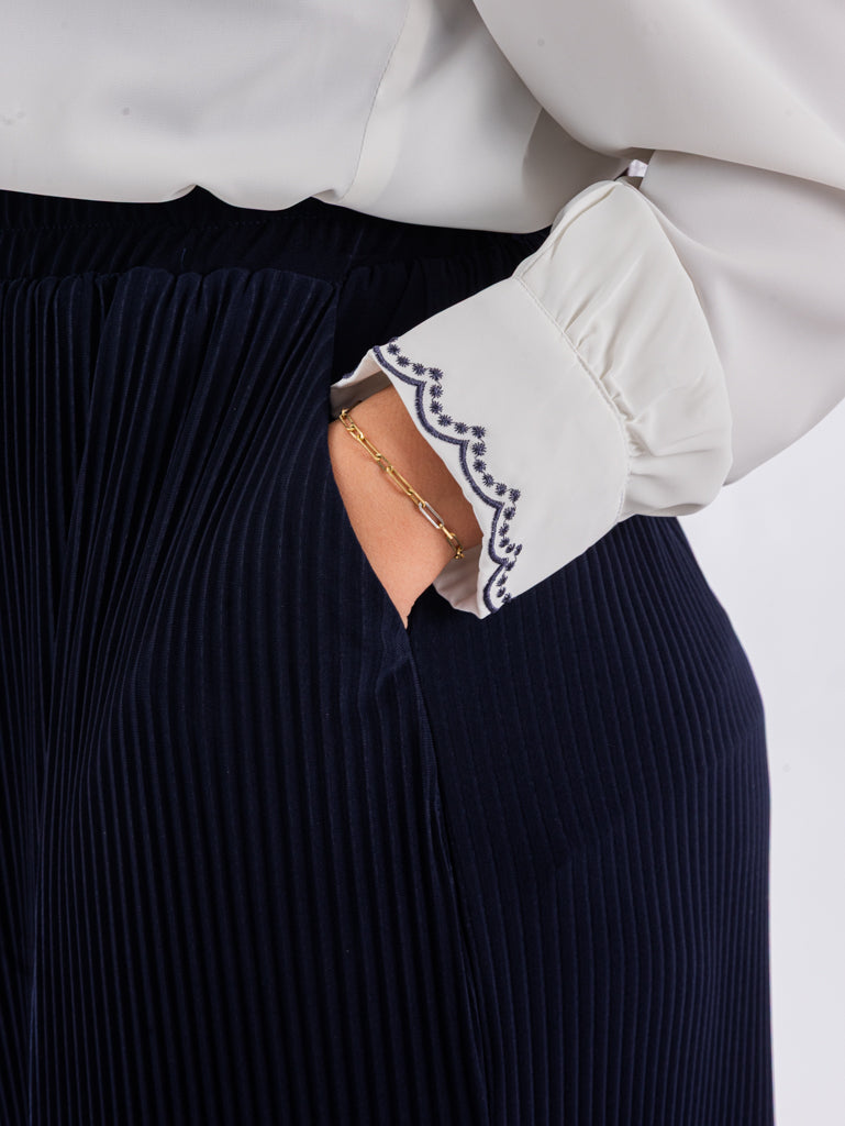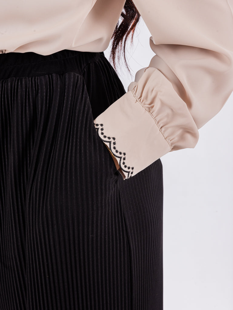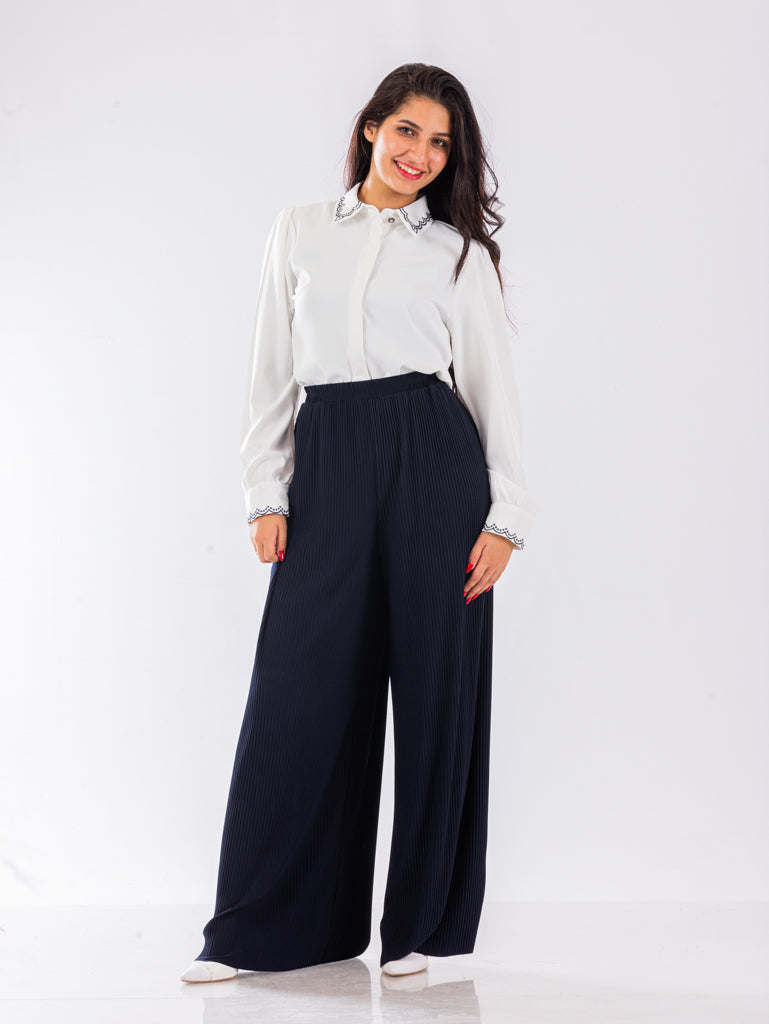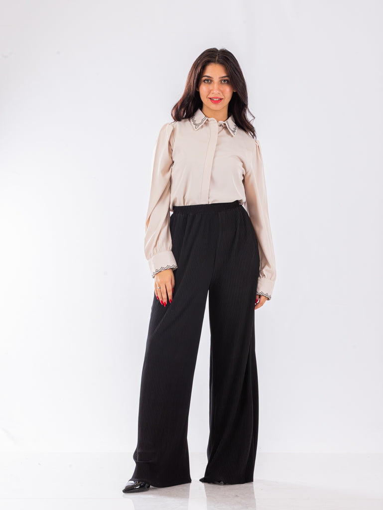 The pleated pants are a modern piece that combines comfort and elegance in one look. They feature soft pleated folds that give them a flowing shape and subtle movement, adding a touch of charm to the outfit. Designed with a comfortable fit and a well-shaped waist, they are an ideal choice for daily wear or practical outings.