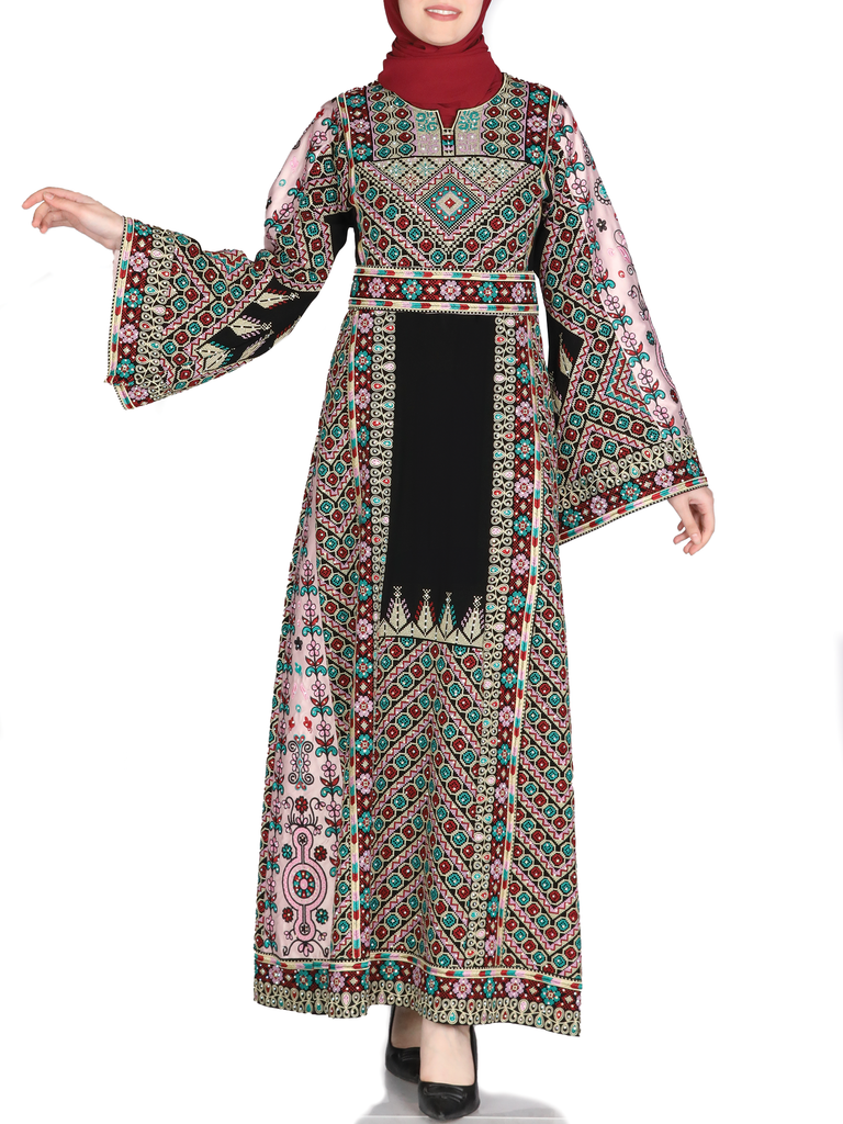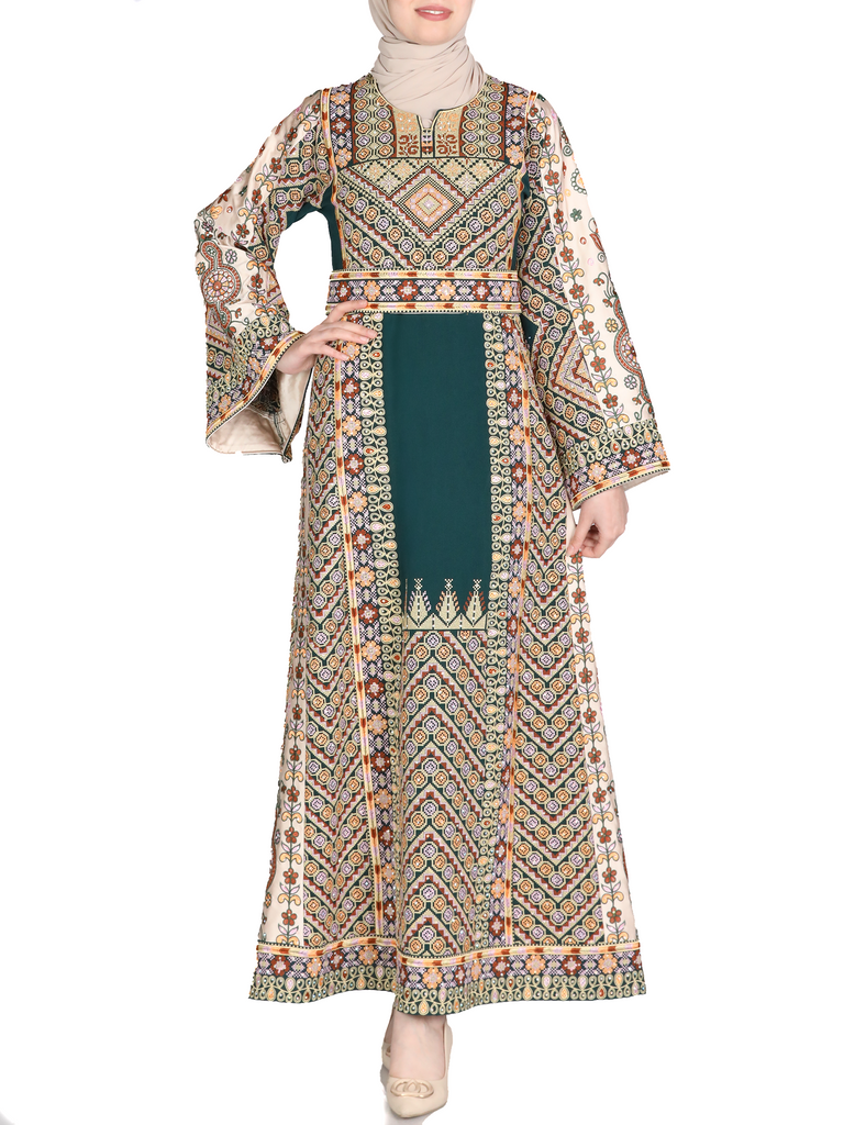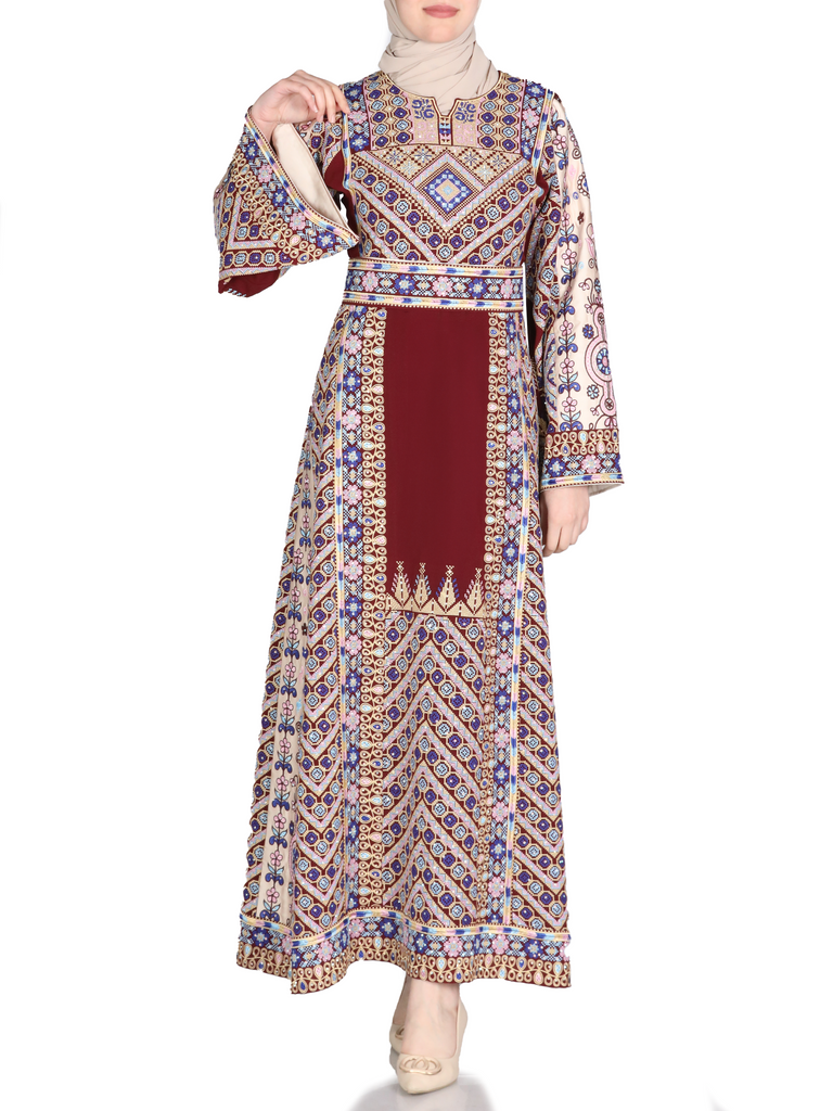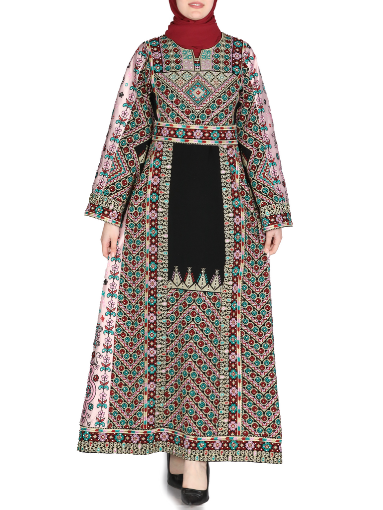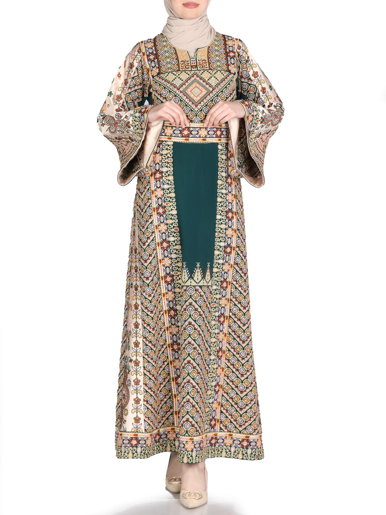 Wide sleeves, extending gracefully from the shoulders, mirror the same exquisite embroidery. Whether they are short, three-quarter, or full-length sleeves, they contribute to the dress’s allure.