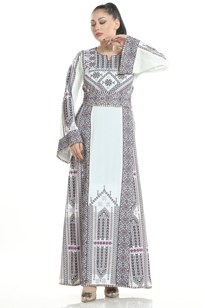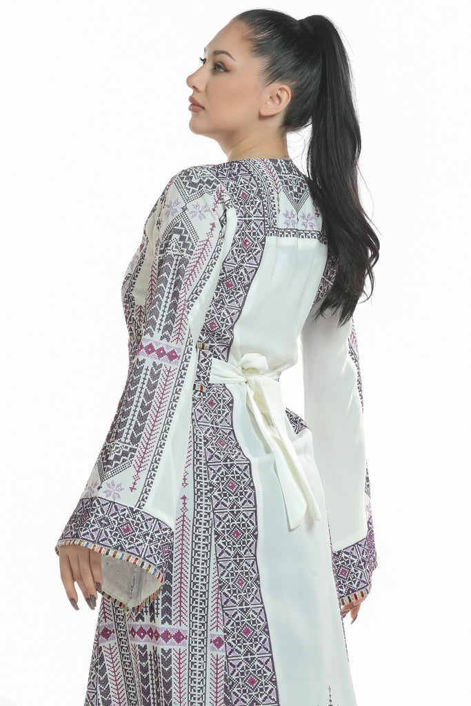 White and purple: this garment has the same design and embroidery, but instead of black, white is used for the fabric. And instead of gold, bright purple is used for decorative patterns. This Color gives an atmosphere of liveliness and cheerfulness to the dress.