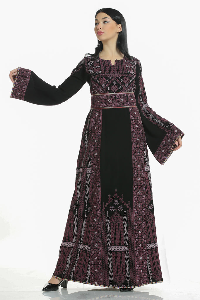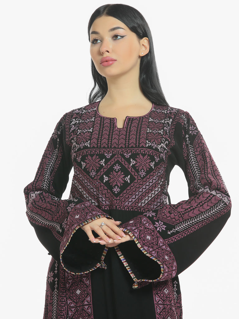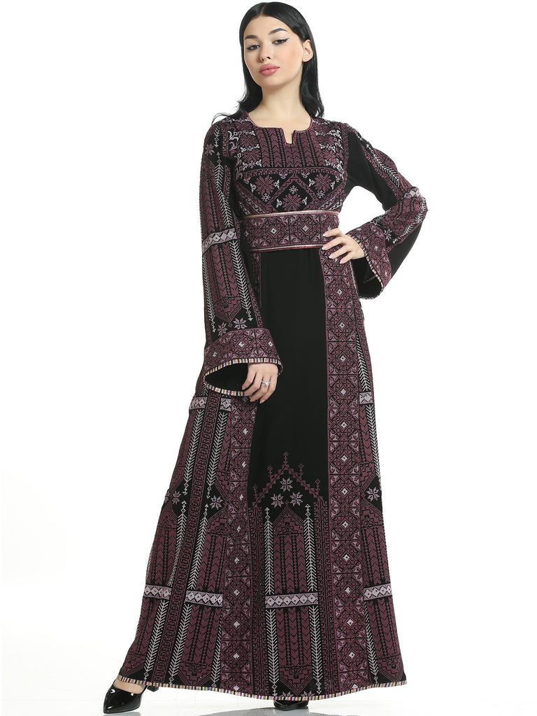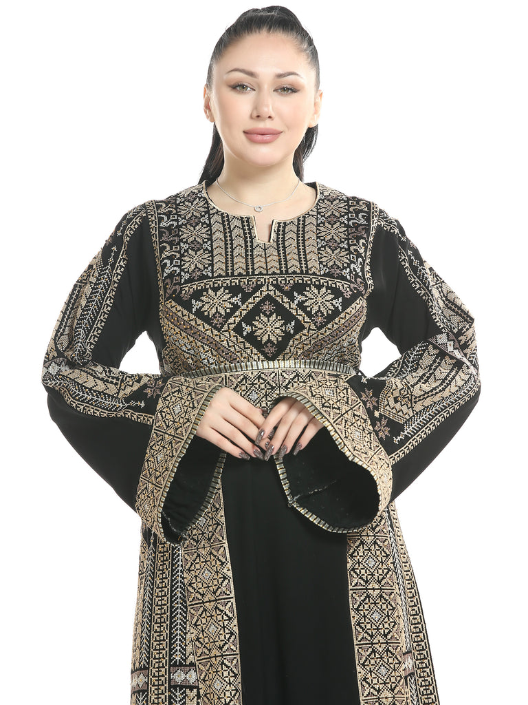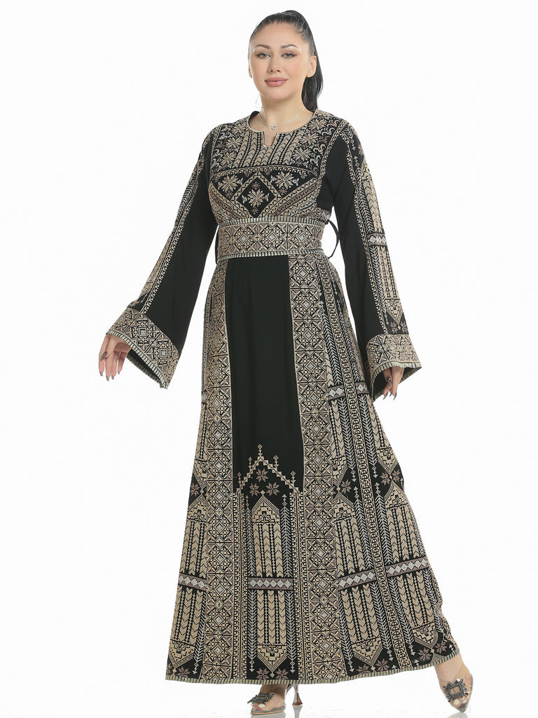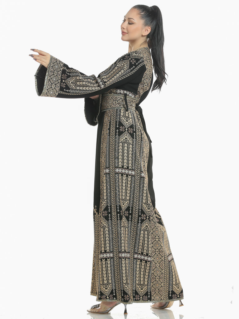 This garment is a piece of textile art, decorated with intricate and detailed embroideries, showing high skill in the craft. The dress is made of black fabric, which contrasts beautifully with the golden color that forms the decorative patterns. Patterns include geometric shapes and flowers, harmoniously and harmoniously intertwined, create an amazing visual effect. Geometric patterns interspersed with drawings of flowers, add a touch of natural beauty and femininity. Floral and geometric patterns cover the entire dress, from the collar to the hem, and from the sleeves to the sides. The collar is stylishly designed, fits into the overall aesthetic of the dress. The sleeves are wide, featuring a wide design at the ends, showcasing detailed embroideries that match the body design. The front of the dress is decorated with a wide strip of white fabric, stretching from the collar to the hem, surrounded by similar embroideries. A silver belt defines the waist, accentuates the shape of the dress and adds a touch of elegance.