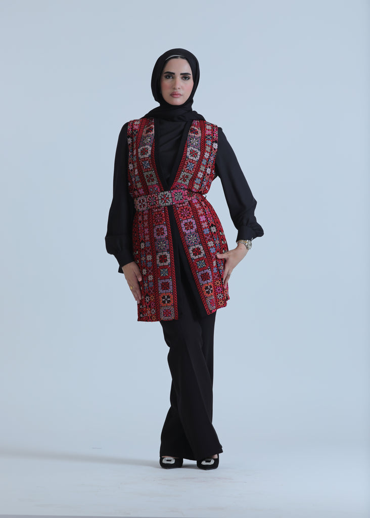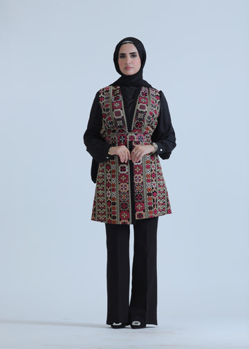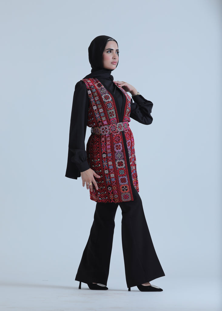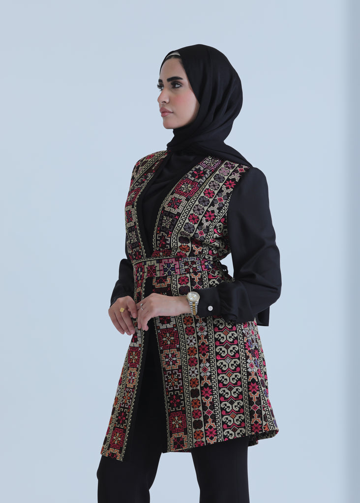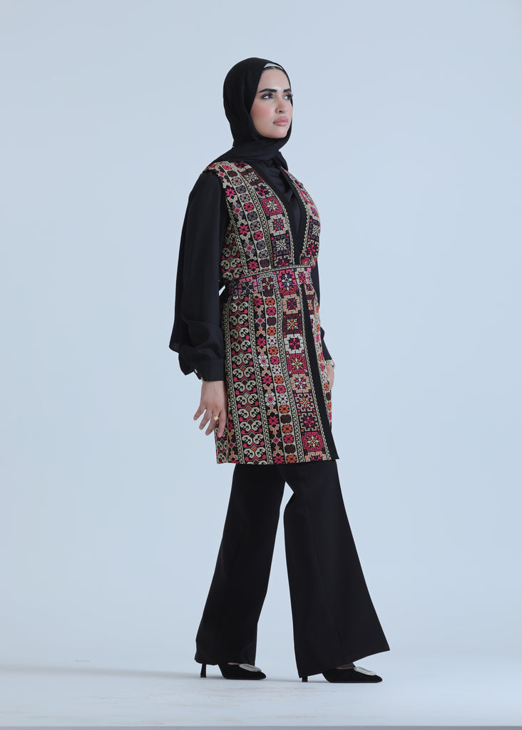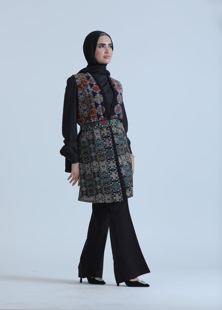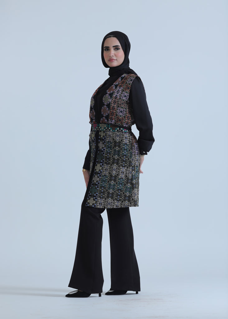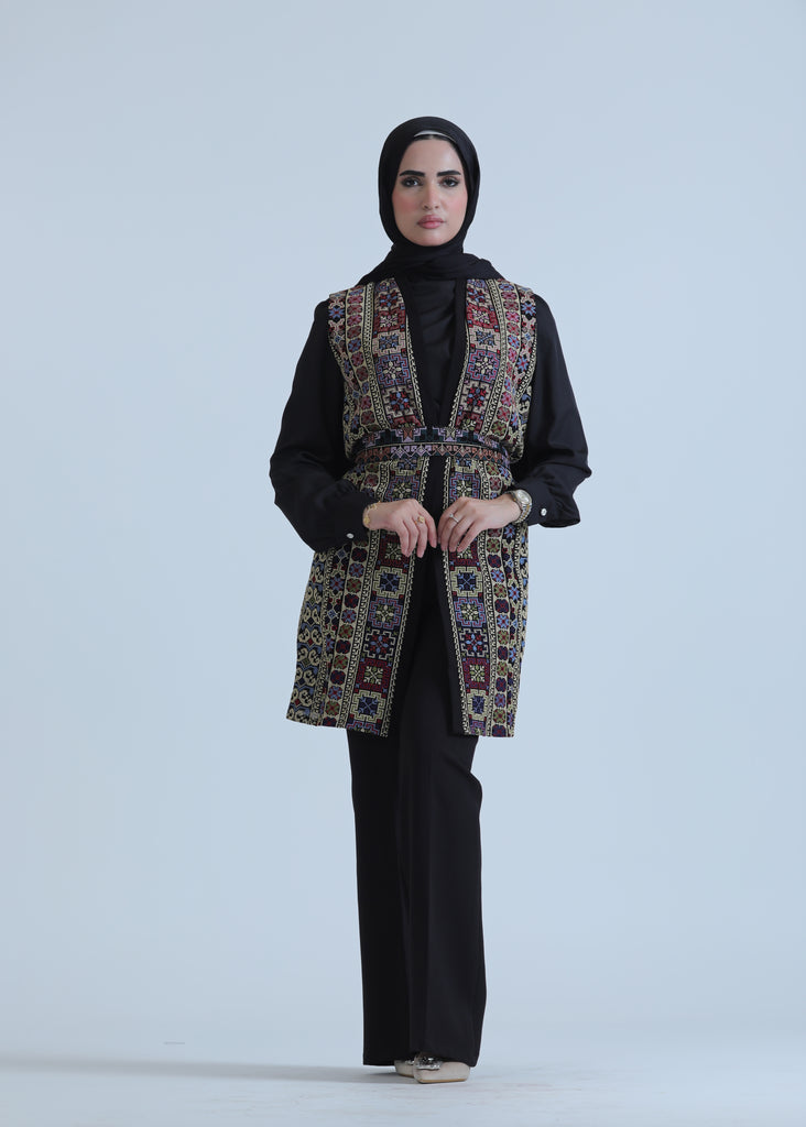 The embroidered vest is an elegant artistic piece that adds a luxurious touch to any look. It features intricate embroidery that reflects high craftsmanship and refined taste, making it an ideal choice for special occasions or outfits that call for distinction and elegance.
