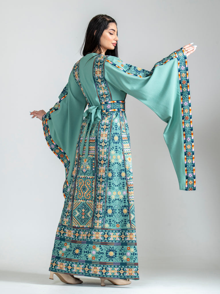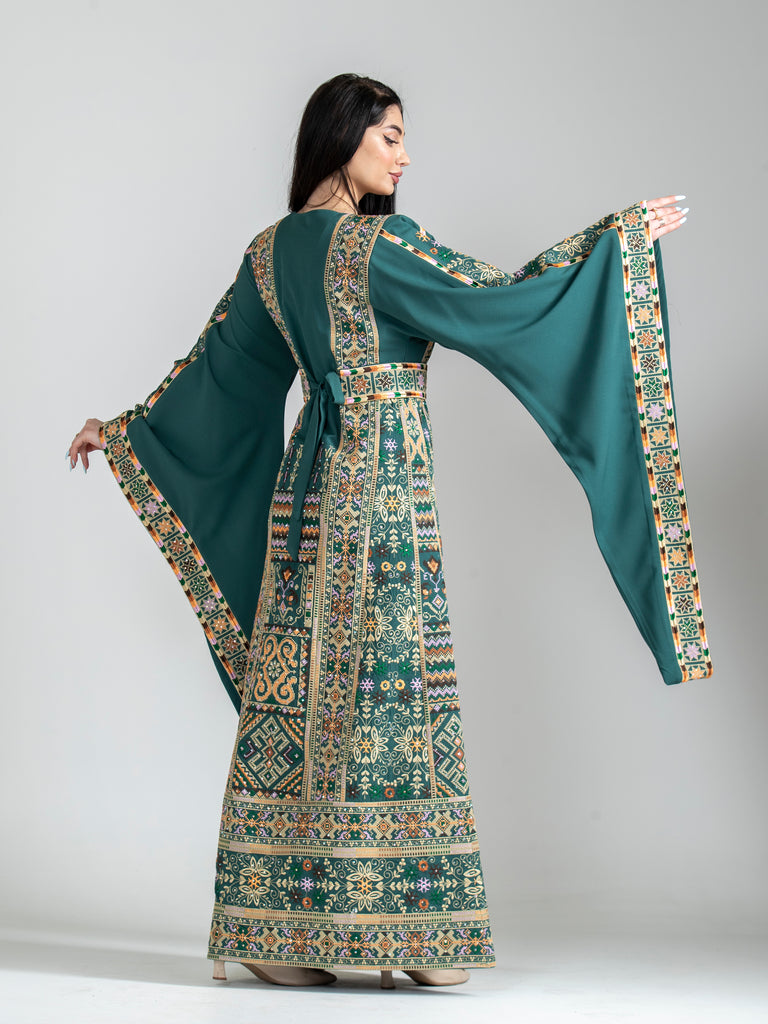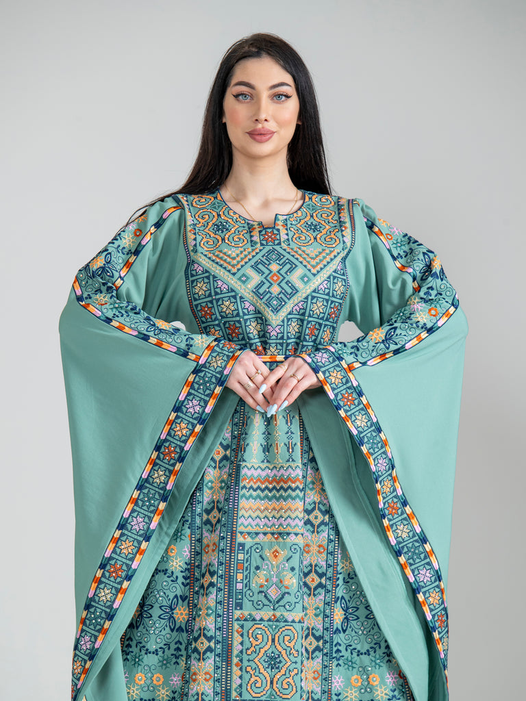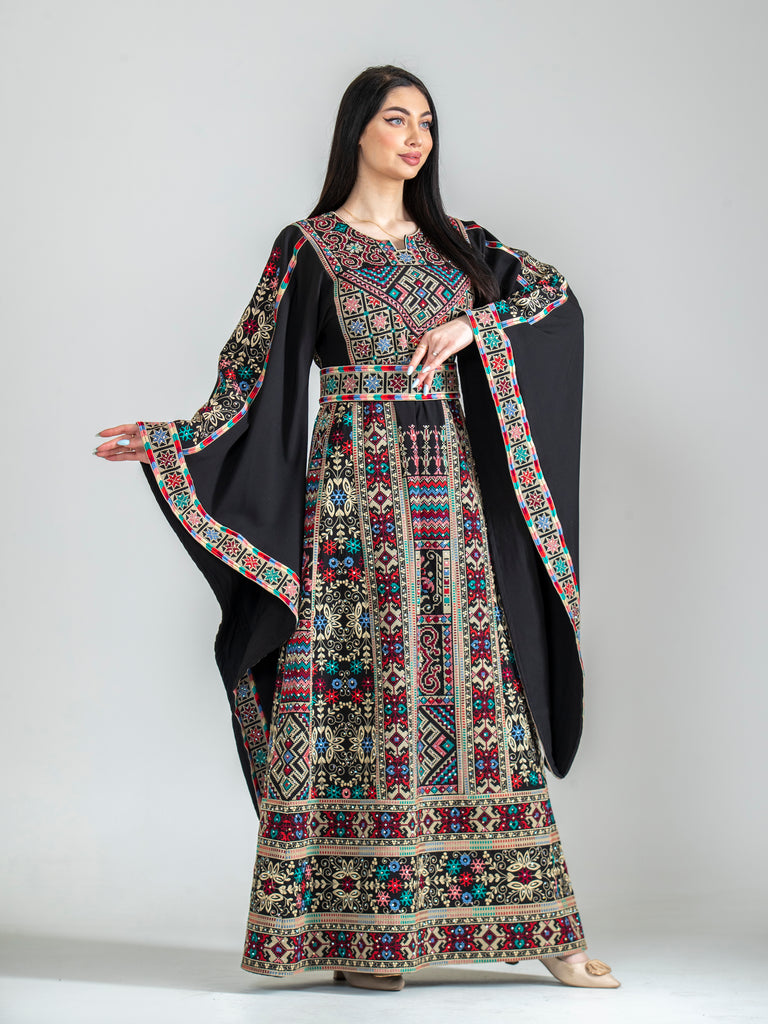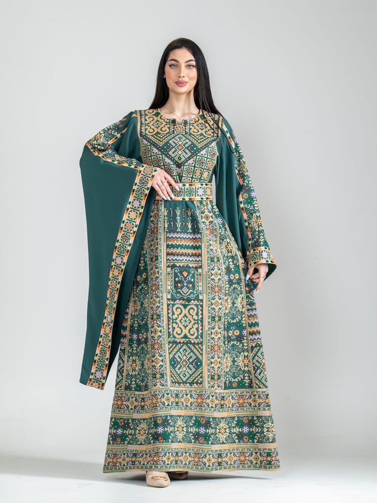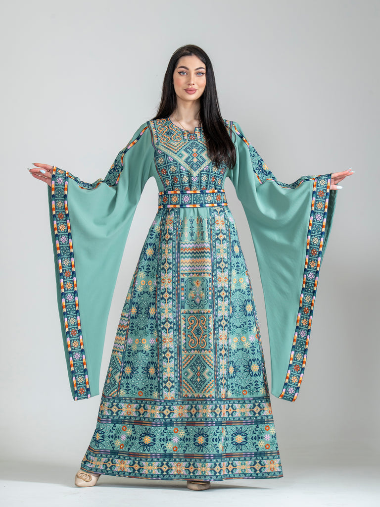 This dress features a luxurious character that combines elegance and sophistication in every detail. It is adorned with fine, meticulously crafted embroidery that adds an artistic and refined touch, reflecting high taste and exceptional design quality. Made from a soft, flowing fabric, it offers a graceful presence and a clearly luxurious look, with a balanced cut that enhances the silhouette and highlights the dress’s beautiful details.
